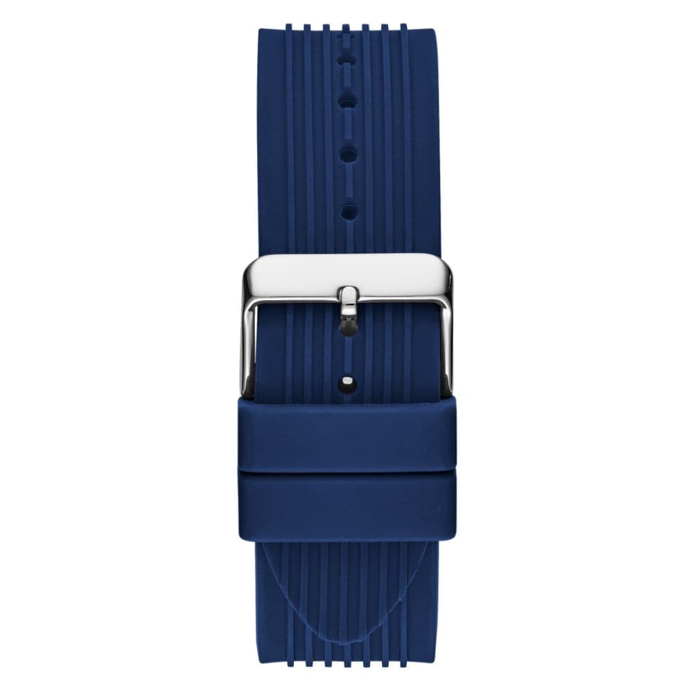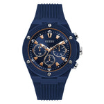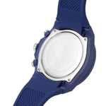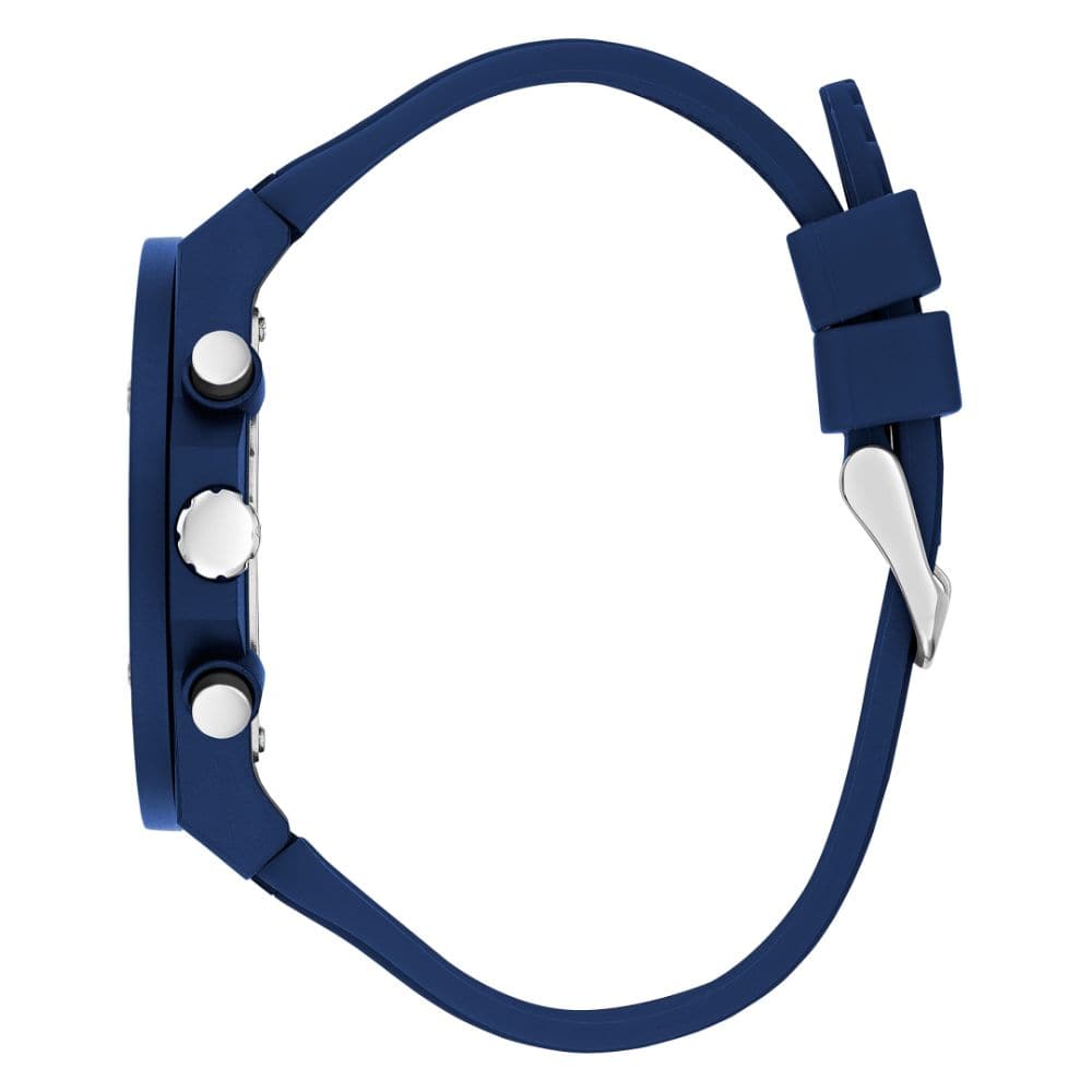 A bold hyperactive style that will definitely make an impact. This timepiece features a blue chrono-look multi-function dial and rose gold accents with sustainable blue nylon case and red silicone strap.