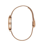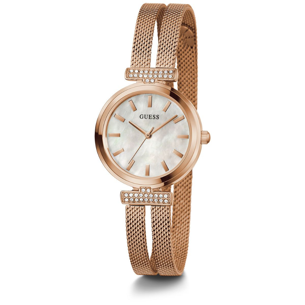 Sweet and sophisticated, this silhouette features a see-thru dial with quattro G pattern design at the 6 o clock hour and a fully crystal bezel with a t bar connection to its chic polished bracelet