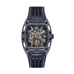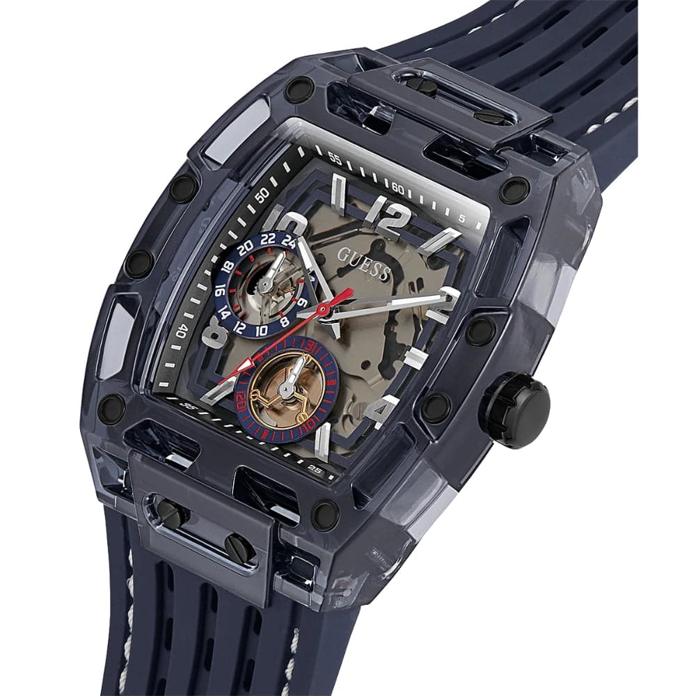 Skeleton dial details keep this phoenix on the rise. This style features a polycarbonate cut-thru barrel shaped case with black screw details and a cut-thru multi-function dial paired with a silicone strap with contrast stitching.A bold hyperactive style that will definitely make an impact. This timepiece features a chrono-look multi-function dial with a gold case and black nylon top ring complete with screw detailing. This style features a top ring that is made from 45% bio-based materials and a strap that is 49% bio-based.
