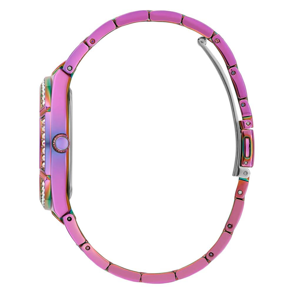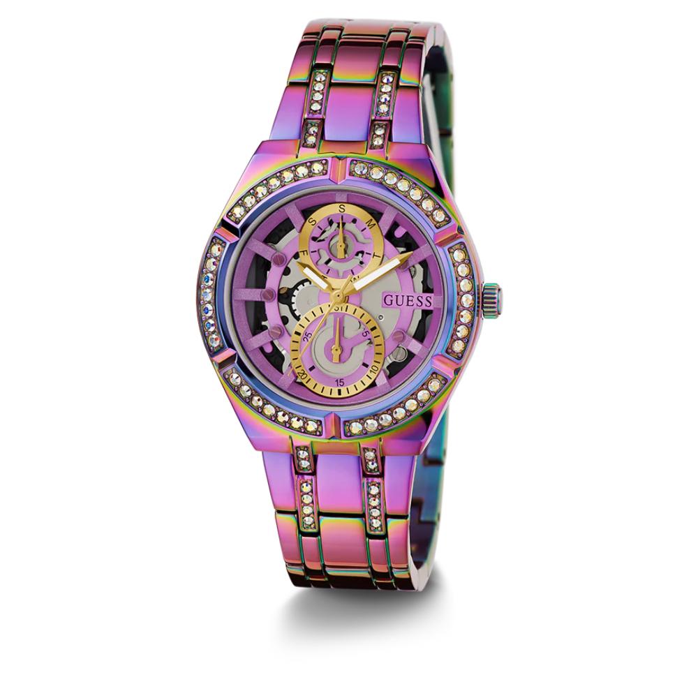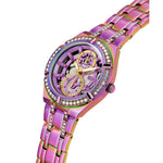 An alluring style that is sure to stand out against any look you pair with it. Featuring a beautifully cut thru look on it's dial with a multi-function movement and crystal detail throughout the bracelet connection
