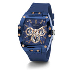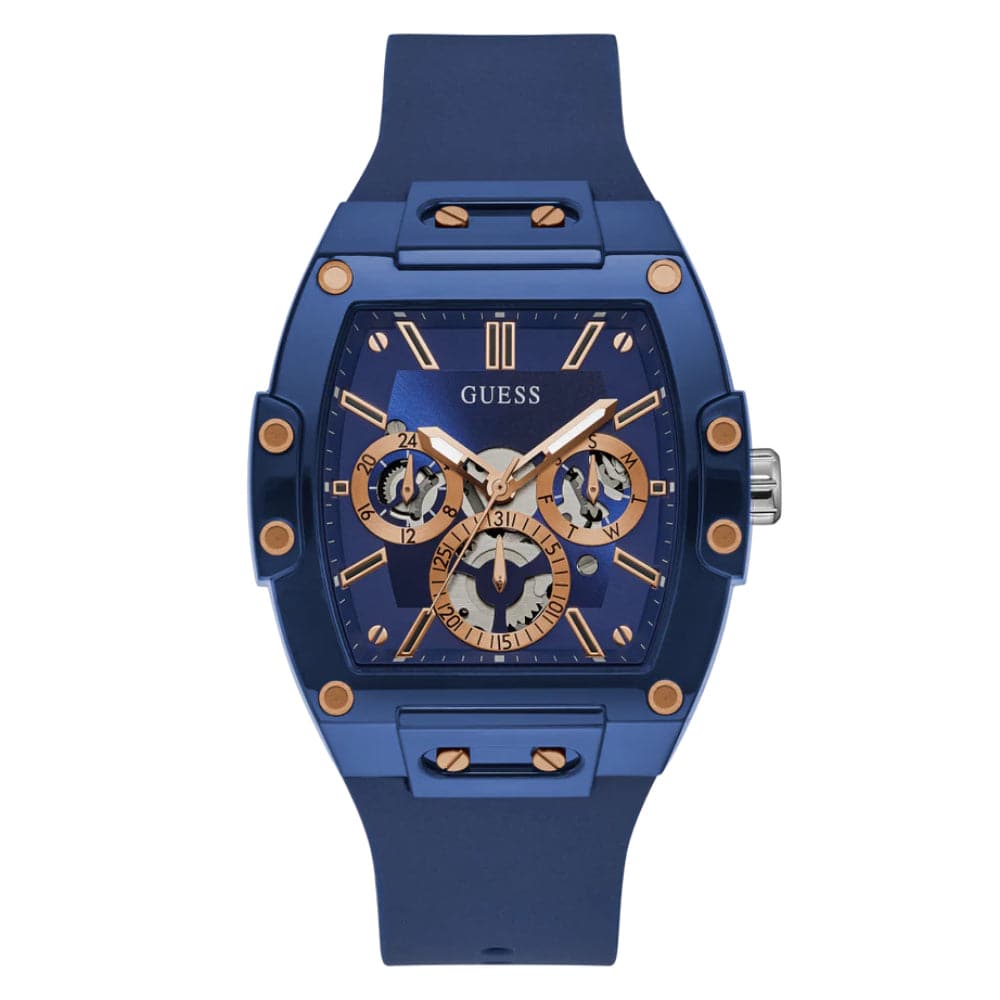 Skeleton dial details keep this phoenix on the rise. This style features a nylon barrel shaped case with rose gold screw details and a blue multi-function dial and rose gold accents paired with a blue silicone strap.