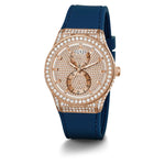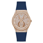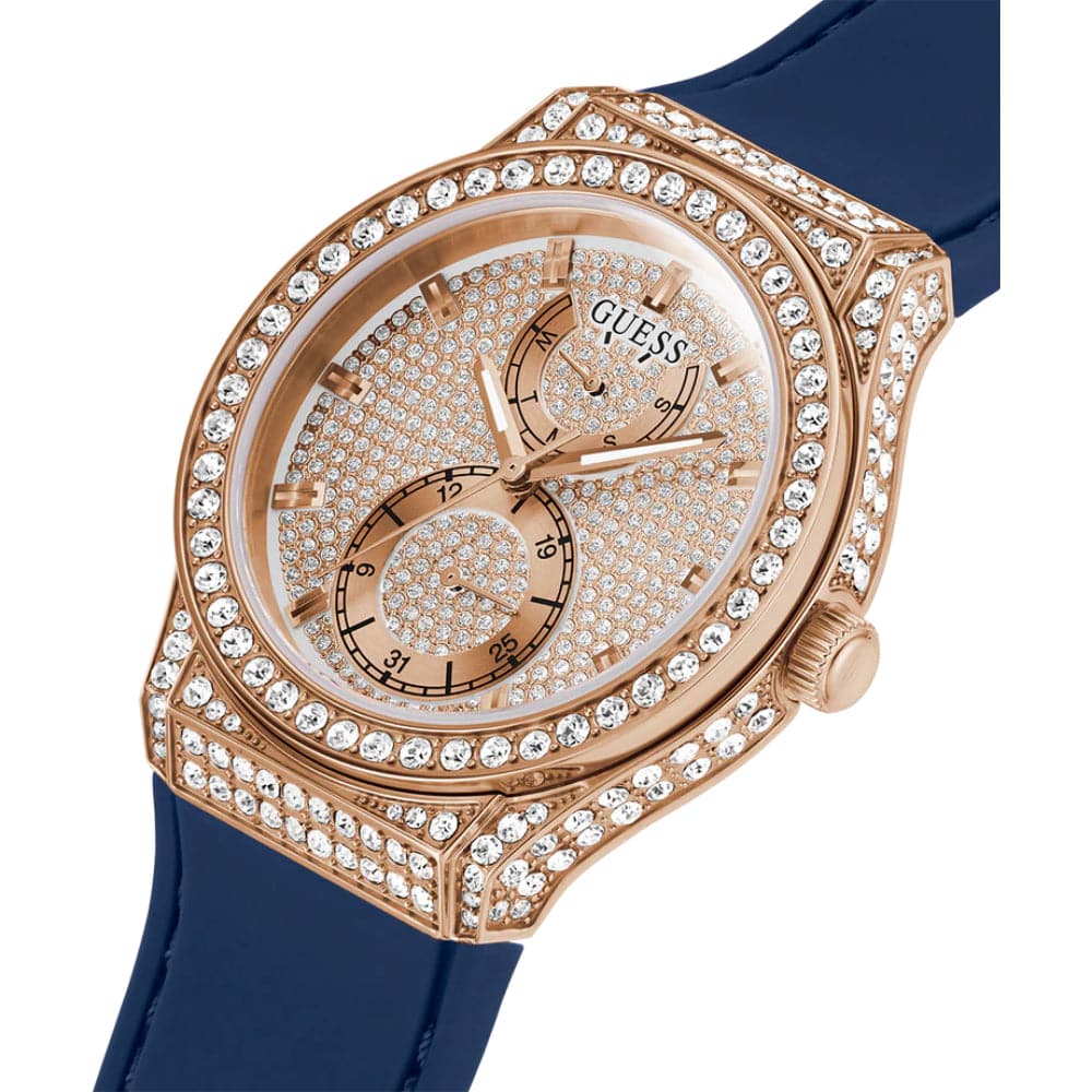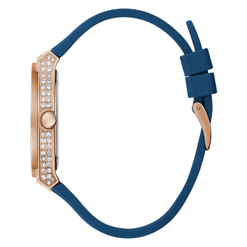 Crystals from every angle! This style has a full design of crystal embellishment from either side to the top as well as on the connection to it's sleek silicone strap.