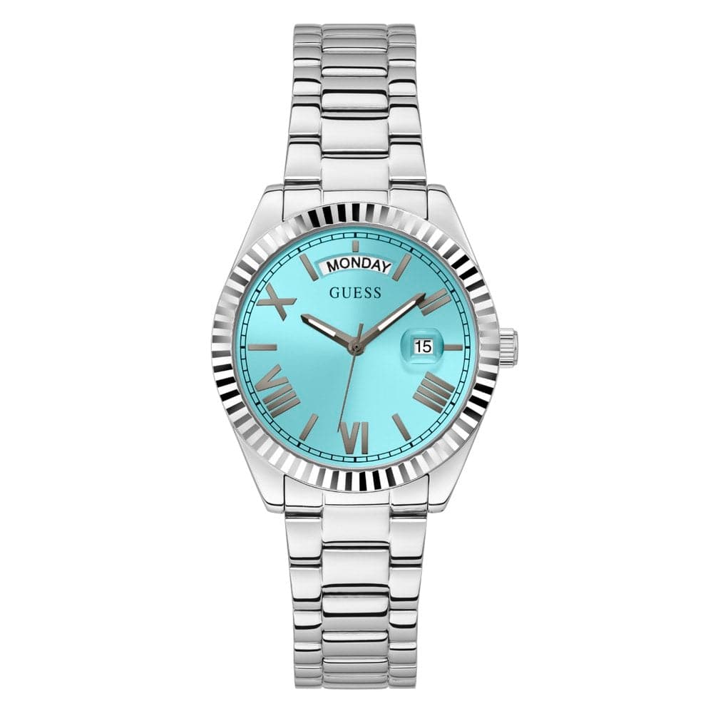 Our Silver Connoisseur Aqua Watch is the definition of classic meets modern. Crafted from a stainless steel material, this watch features a silver tone case, aqua blue dial color, an aluminum case bezel, pilot buckle closure and a day/date movement. Perfect for taking your look from day to night this season.