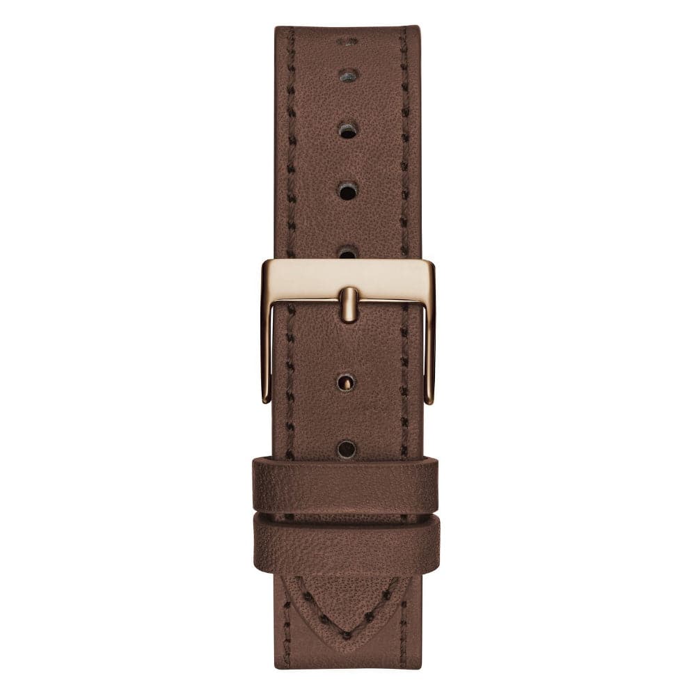 Combining simplicity and performance, this women's analog watch from the Fame collection by GUESS is sure to impress you. Enclosed in a 30 mm case, the rose gold asymmetrical dial looks quite attractive. It displays plain three hands and a crown for time adjustment. The genuine leather strap exudes a brown hue that accentuates the look of the watch. Moreover, it is fitted with a buckle clasp to ensure a secure fit on the wrist.