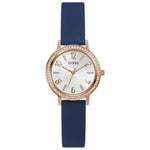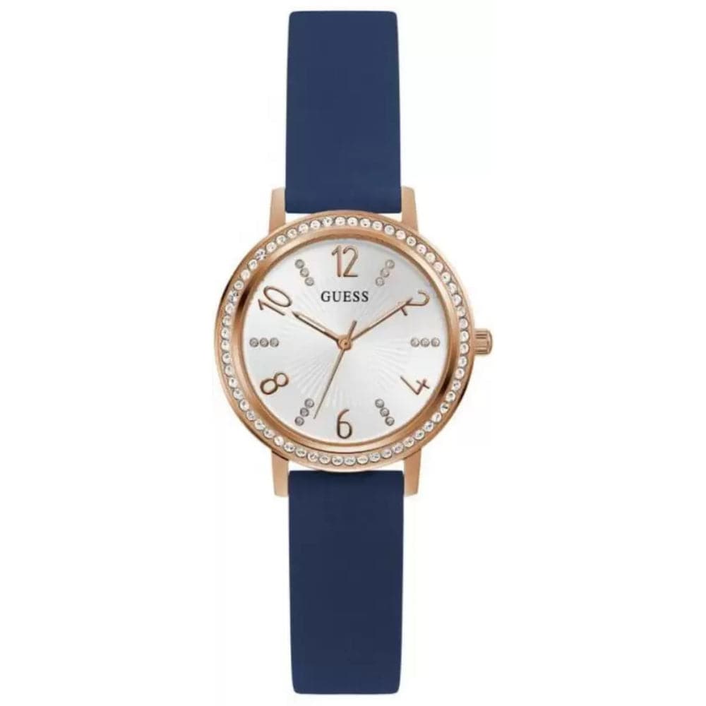 Guess Tri Luxe GW0591L1 is a women's casual watch with an envelope decorated with crystals connected to a blue leather strap. The silver shield is also decorated with crystals and guilling. The dial protects the mineral slide. The whole for action is driven by a quartz mechanism.