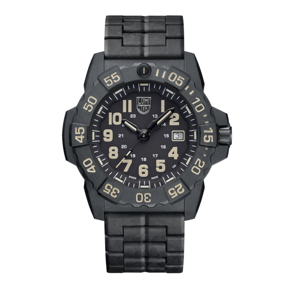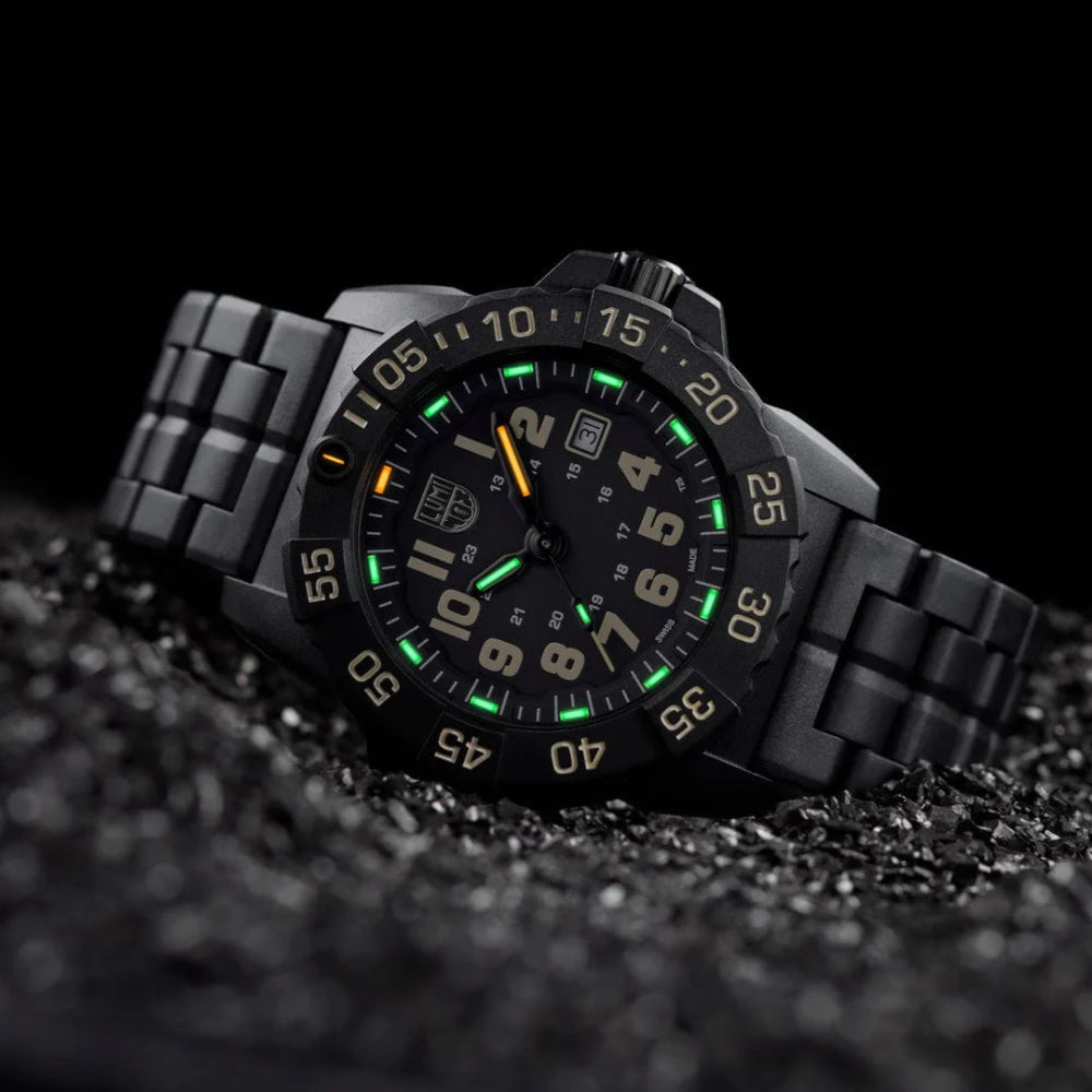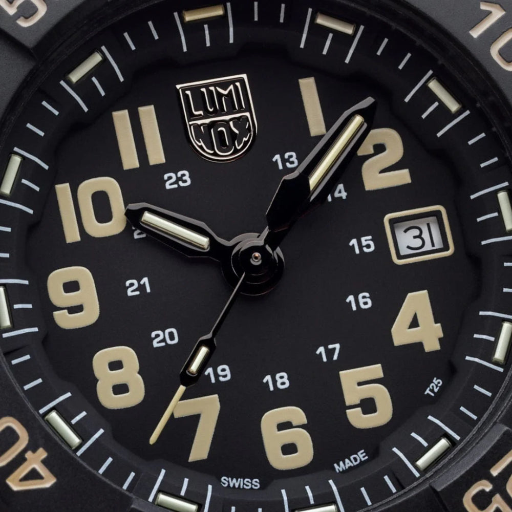 This stealth-inspired black and sand edition is engineered entirely from our proprietary CARBONOX™ material. With its case, bezel, and even bracelet constructed from CARBONOX™, this model is one of the lightest in the collection, offering unmatched durability, strength, and comfort. CARBONOX™ is a high-performance, carbon-based material that is ultra-light, hypoallergenic, and highly resistant to temperature fluctuations, chemicals, and impacts. This robust timepiece features a 45mm case size, 200-meter water resistance, and a scratch-resistant hardened mineral crystal. The matte-black finish enhances the watch’s tactical aesthetic, minimizing reflections and wear. The uni-directional rotating bezel, also crafted from CARBONOX™, provides precise time tracking, while the screw-down stainless-steel case back reinforces durability. As with all Luminox timepieces, this edition features Luminox Light Technology (LLT), ensuring constant visibility for up to 25 years in any lighting condition. Whether navigating night operations, deep waters, or rugged terrain, its self-powered illumination guarantees legibility without requiring an external light source or battery recharge.