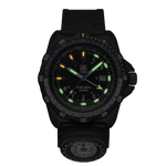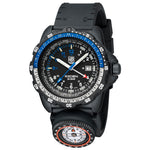 Powered by a Swiss quartz GMT movement, this watch allows you to track two time zones simultaneously, ideal for global missions or international travel. Its black nitrile rubber strap is engineered with integrated map scales and ruler markings, plus a detachable compass, transforming the timepiece into a complete navigation instrument. The set also includes an additional black webbing strap for added versatility.