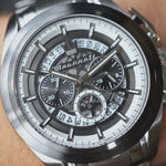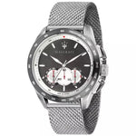 Silver-tone stainless steel case with a silver-tone stainless steel milanese mesh bracelet. Fixed with engraved tachymeter dark grey stainless steel bezel. Anthracite dial with silver-tone hands and index hour markers. Minute markers around the outer rim. Dial Type: Analog. Luminescent hands and markers. Chronograph - three sub-dials displaying: 60 second, 30 minute and 24 hour. Miyota Caliber JS50 quartz movement. Scratch resistant mineral crystal. Screw down crown. Solid case back. Round case shape, case size: 45 mm, case thickness: 13 mm. Band width: 22 mm. Milanese clasp. Water resistant at 100 meters / 330 feet. Functions: chronograph, GMT, second time zone, hour, minute, second. Casual watch style.