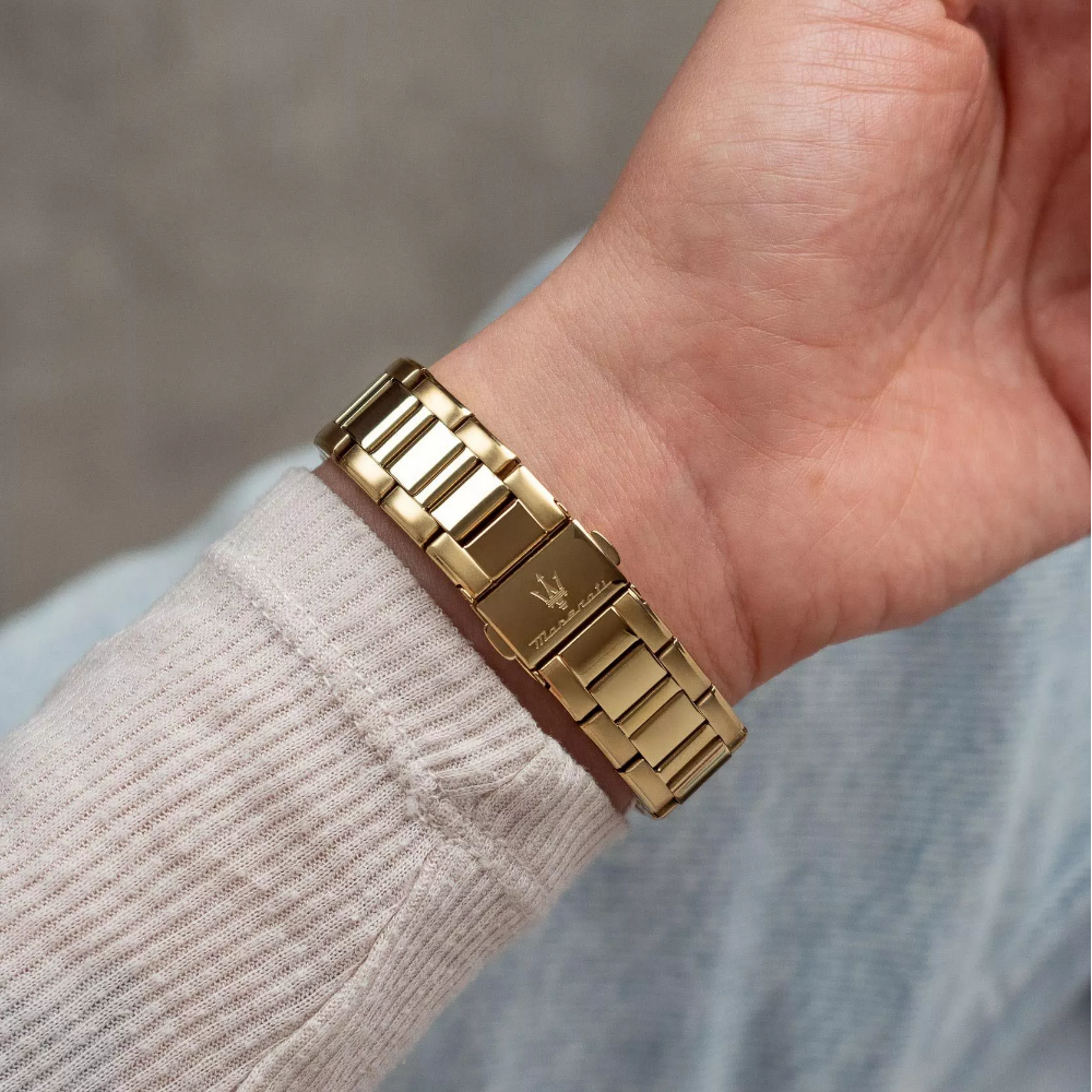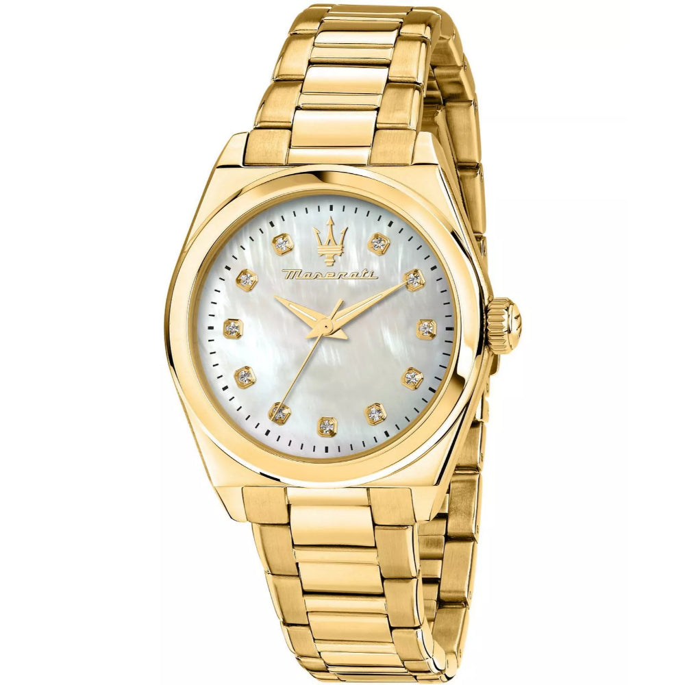 The Maserati Velocitá R8853152502 women's watch is a unique model that combines elegance and modernity. It has a gold-colored stainless steel envelope, which gives it a timeless touch. The dial of the watch is white in color, which contrasts with the envelope, and its surface is covered by mineral glass. The watch is waterproof to 50 meters, which protects against minor splashes. The bracelet, also made of stainless steel in a golden shade, perfectly harmonizes with the whole, and the width of the envelope of 35 mm makes the watch subtle and feminine. Another highlight is the mother-of-pearl decoration on the dial, which gives it a unique shine. The watch comes with a two-year warranty.