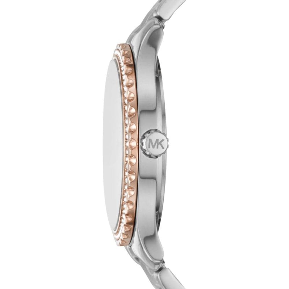 A Michael Kors chronograph watch in silver-tone stainless steel has a polished look and a striking shine. Roman numerals and a date wheel accent the dial, which is outlined by a textured bezel. Hinged-snap clasp.