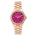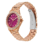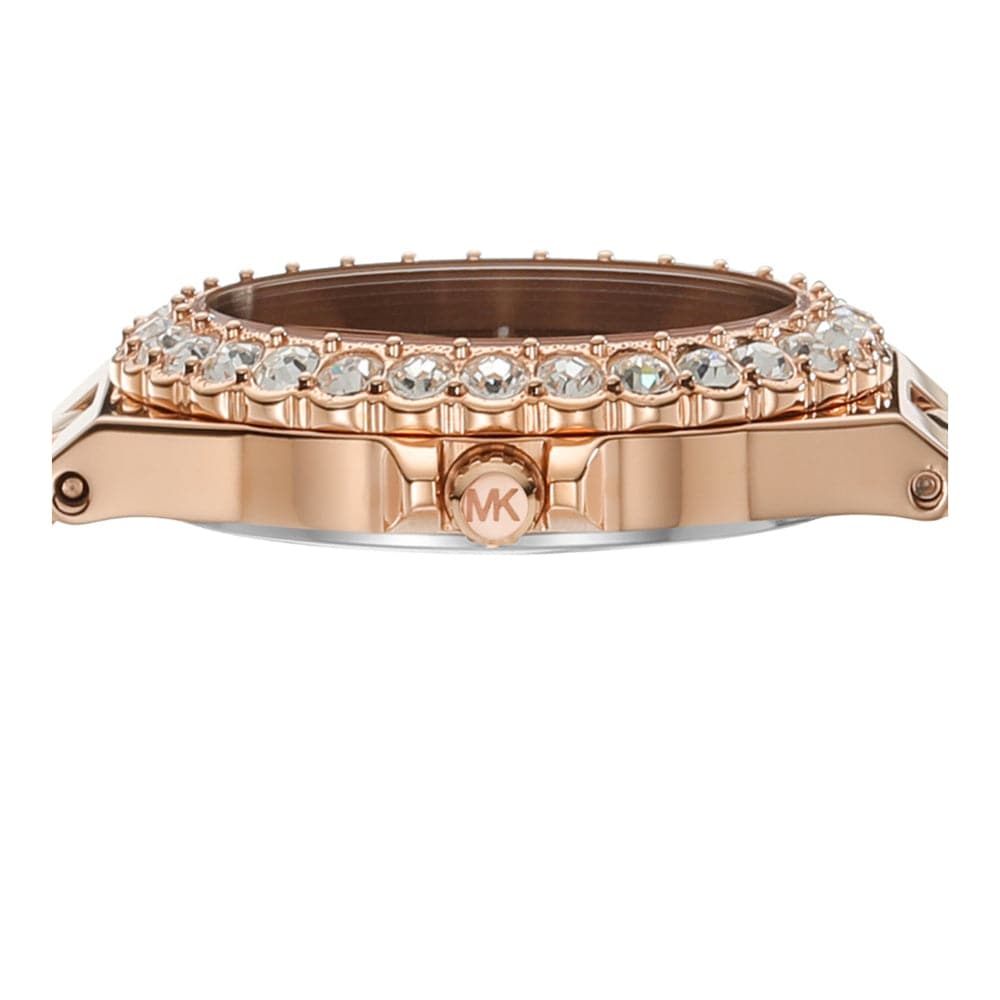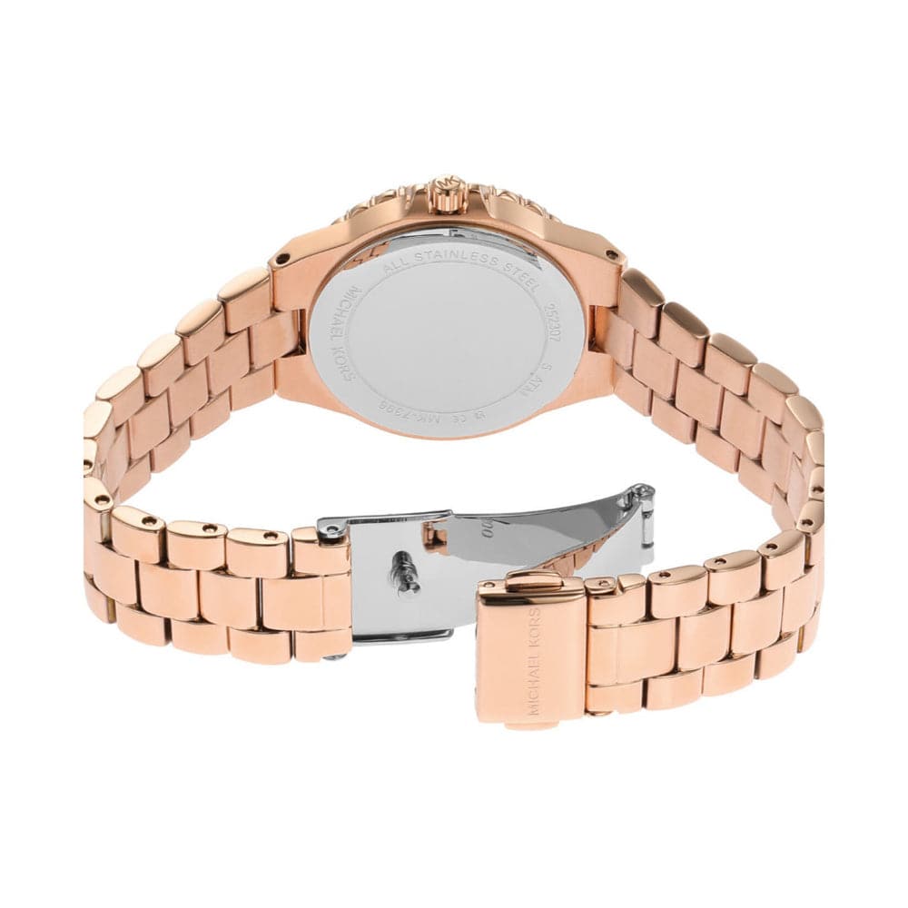 Amaze everyone around you by wearing this women's analog watch from Michael Kors. The pink round dial is protected by a mineral glass. It has a crown for time adjustment. The stainless steel strap comes in a rose gold hue that further elevates the look of the timekeeper. Besides, it is completed with a double locking fold-over clasp to ensure a secure fit on the wrist.