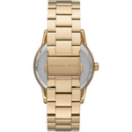 A Michael Kors chronograph watch in silver-tone stainless steel has a polished look and a striking shine. Roman numerals and a date wheel accent the dial, which is outlined by a textured bezel. Hinged-snap clasp.