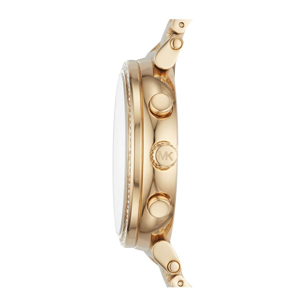 The stylish Sofie shines with a stainless-steel rounded case with a glitz topping, gold sunray chronograph dial and 3-link bracelet.
