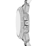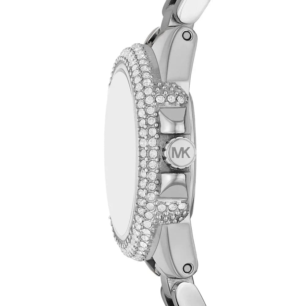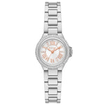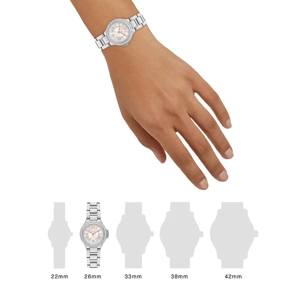 Give your wrist the perfect blend of style and comfort by wearing this women's analog watch from Michael Kors. The white round dial is protected by a mineral glass. A classic look of luxury, this 26mm stainless steel Camille features a pave topring and Roman numerals on the dial. This sleek and sophisticated mini-watch makes the perfect addition to any wardrobe. Besides, it is completed with a fold-over push button clasp with safety clasp to ensure a secure fit on the wrist.