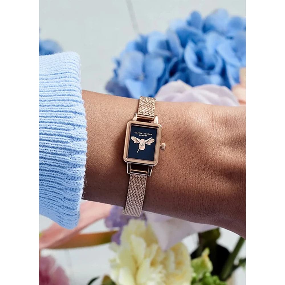 Dainty but with a mighty impact, this mini 16.5mm rectangular dial is everything you’ve been dreaming of. Drawing inspiration from the vintage tank watch but adding all the luxe of our contrasting midnight blue dial and signature bee motif for a contemporary meets classic style. Framed in our best-selling Rose Gold casing and finished with a crisp mesh strap, this watch is the perfect fashion statement and an ideal accessory for those delicate wrists.