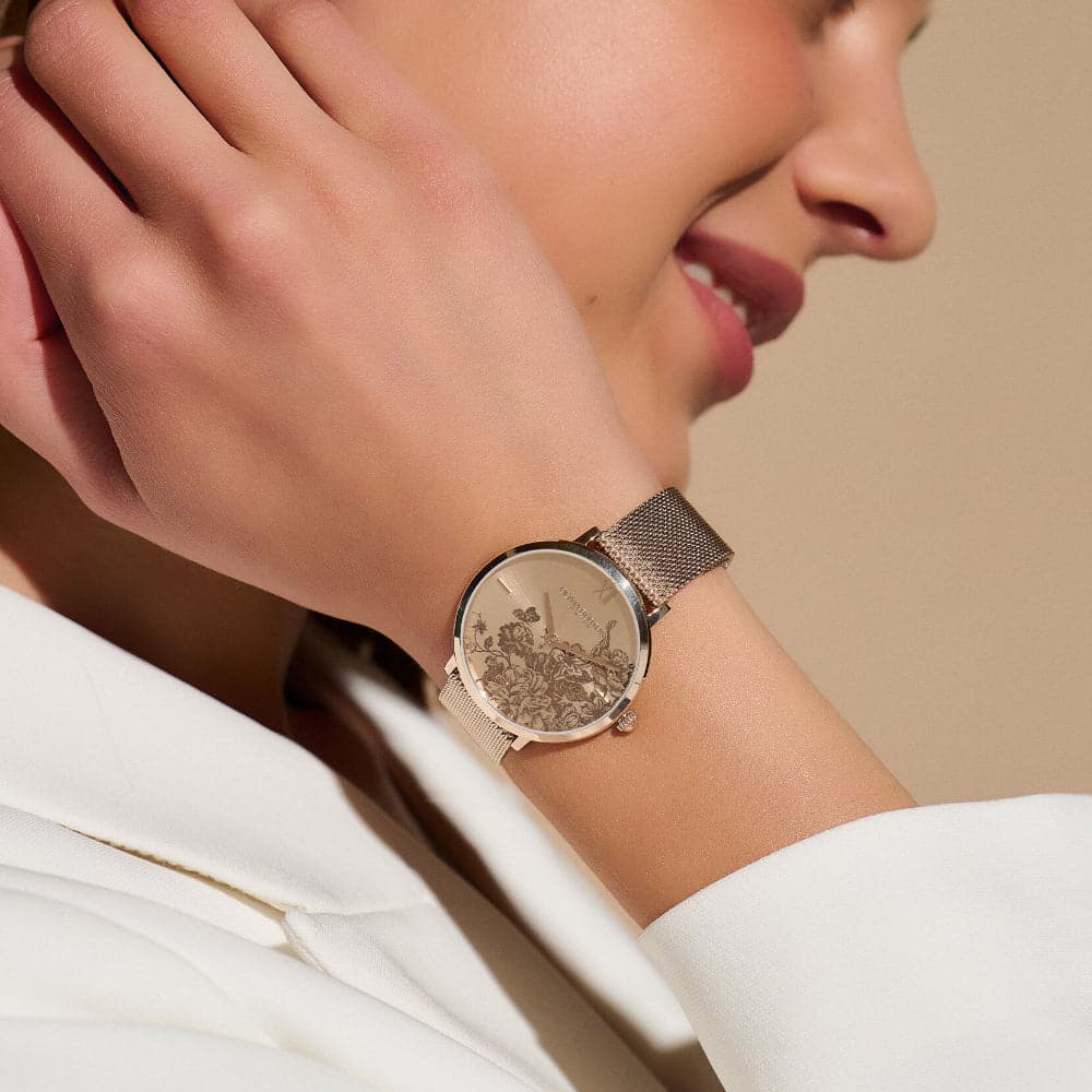 You’ll be smelling the roses and strolling in the countryside with our Floral Blooms watch in classic carnation gold. The latest addition to our Signature collection, beautiful English florals bloom across a blush sunray dial. With carnation gold-plated mesh strap and ultra-slim case, this watch brings an understated, contemporary feel to pretty, expressive florals. Picnic in the sun, anyone?