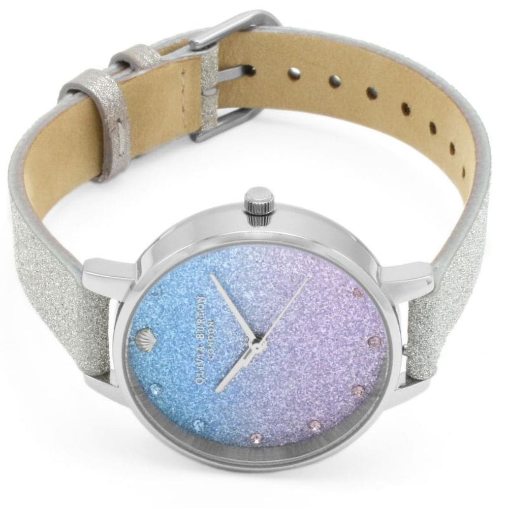 "You'll be dancing with the waves wearing this beautifully sparkly Under The Sea dial from Olivia Burton. The glitter ombre Demi fades softly from blue into lilac, dotted with crystal markers, an adorably tiny little silver shell and matching hands. And just for a little extra shine, we've added our sparkle strap in a go-with-anything silver. Go forth and sparkle.