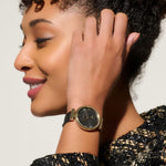 Elegant, refined and extremely stylish, the Minima Bee watch joins our Signature range. Spot the intricate honeycomb design on a moody black dial, perfectly finished with a tiny bee motif and contrast markers in gold. The black leather strap and sculpted gold-plated case give a contemporary feel to a new favorite. Btw, this looks incredible under twinkling lights as an evening look.