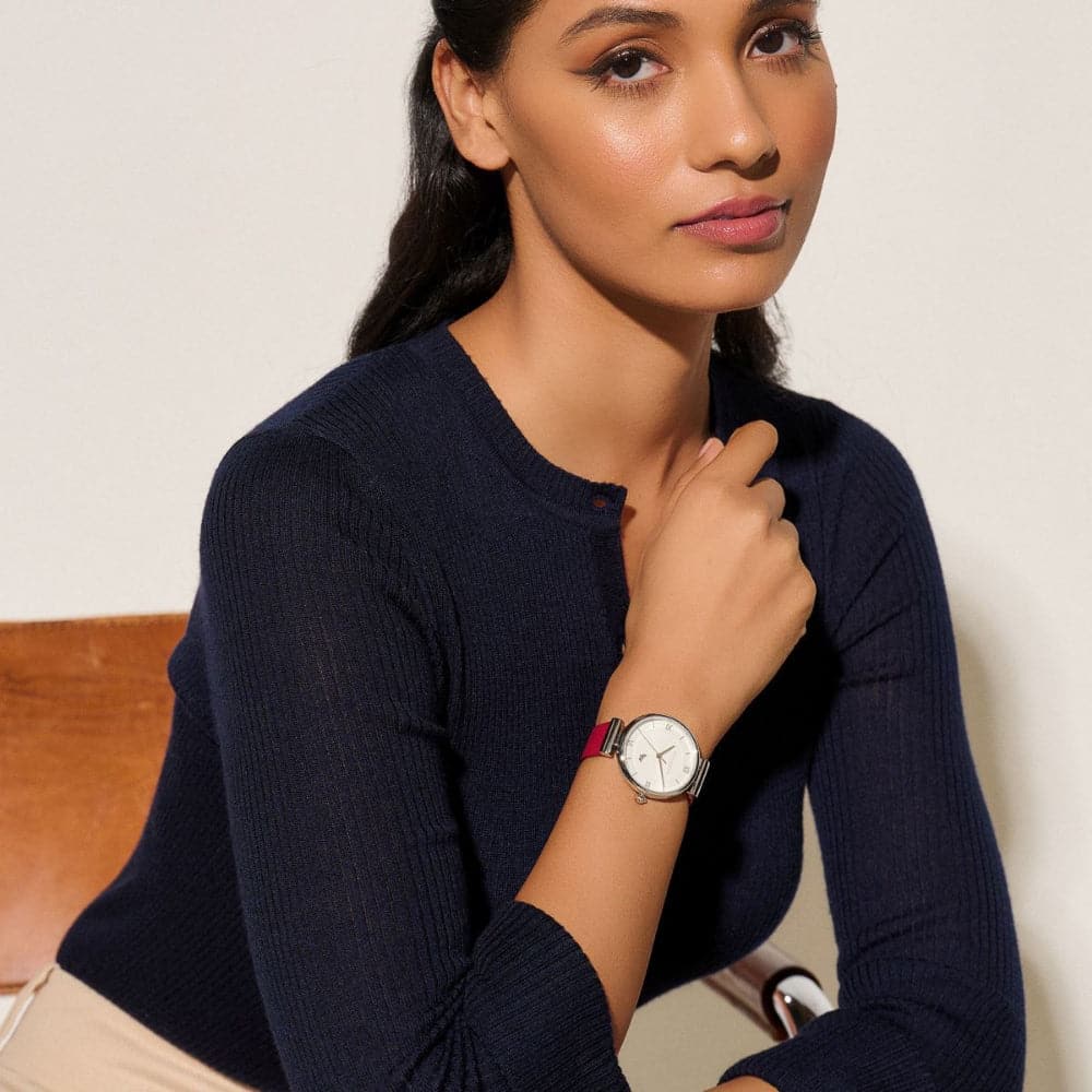 Elegant, refined and extremely stylish, the Minima Bee watch joins our Signature range. Spot the intricate honeycomb design on a silver white dial, perfectly finished with a tiny bee motif and silver markers. There’s a new leather strap in town with this juicy cranberry shade and btw it goes with *everything*. Paired with a sculpted stainless steel case, this design is feminine, contemporary and definitely a new favourite.