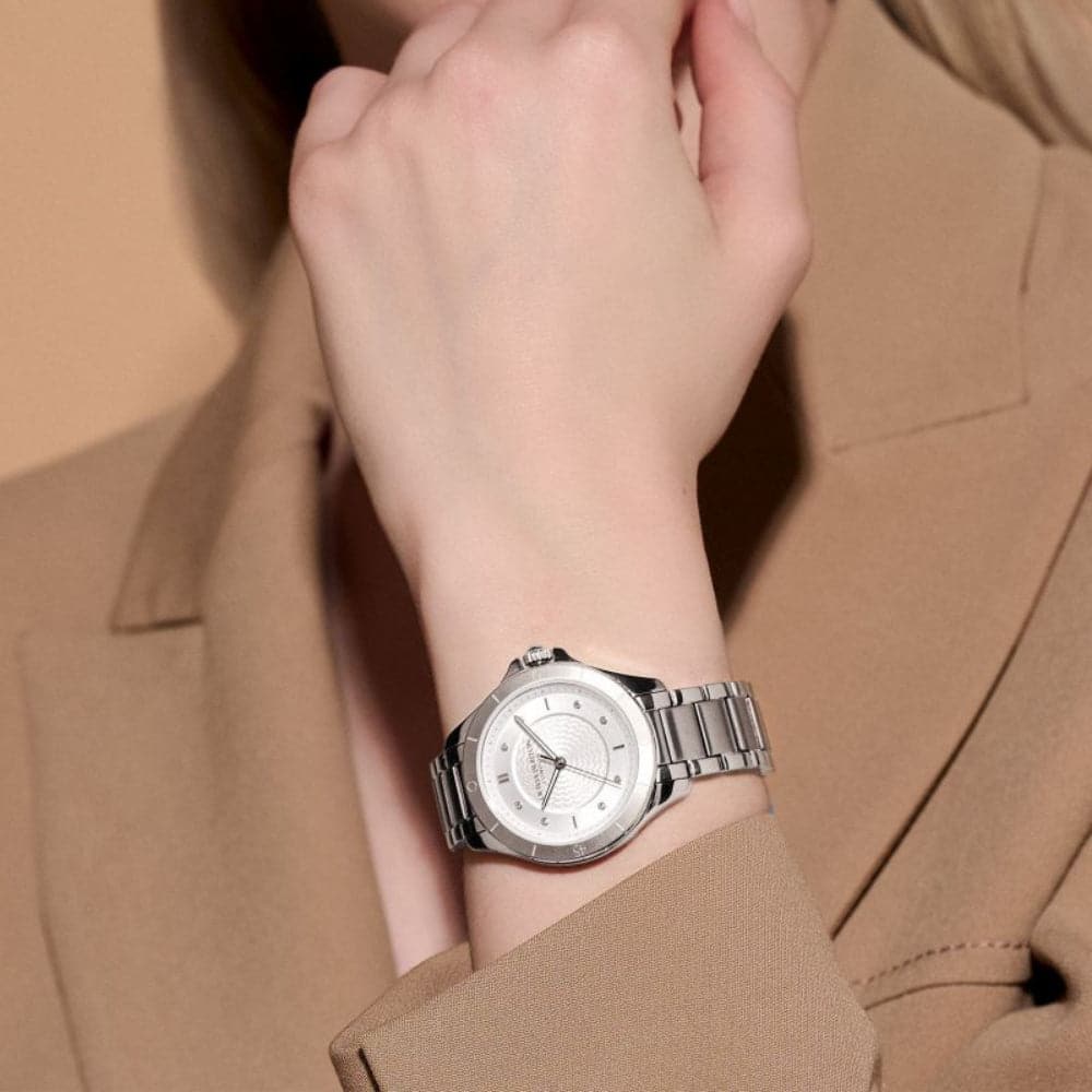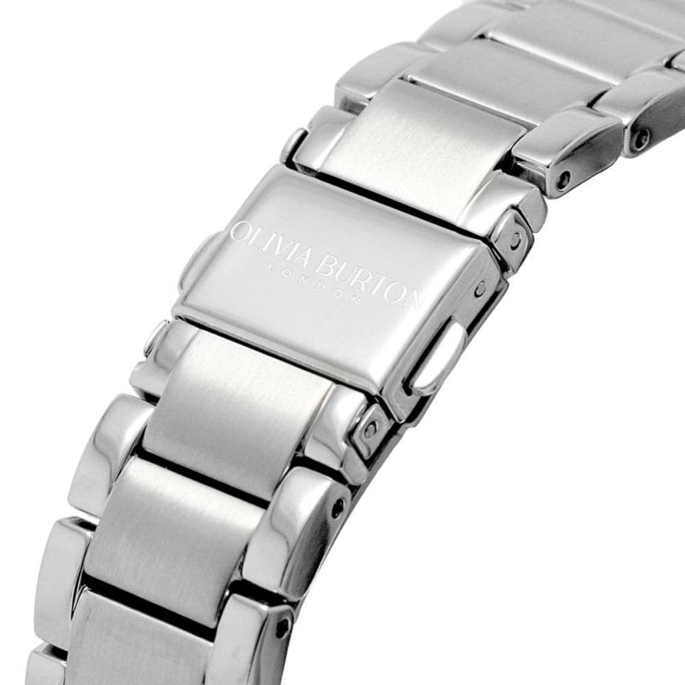 Olivia Burton Sports Luxe Guilloché Watch. Featuring a 36mm Stainless Steel Silver White Dial and Stainless-Steel Link Bracelet.