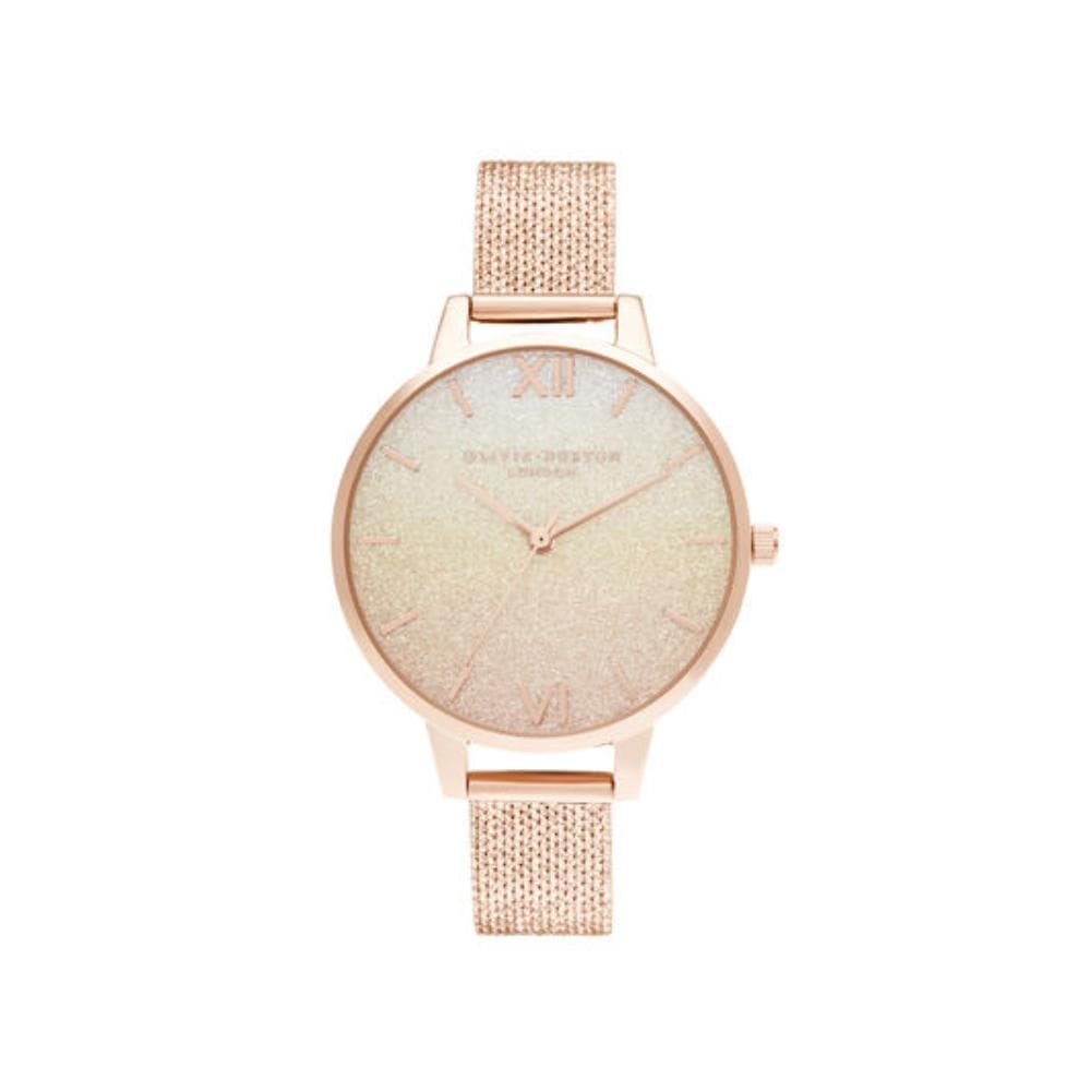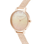 Our 34mm glitter ombr wishing waves dial fades softly from deep orange hues through to yellow, inspired the sun setting over a sparkling sea. Finished with a classic rose gold case and mesh strap, this design is truly mesmerizing.