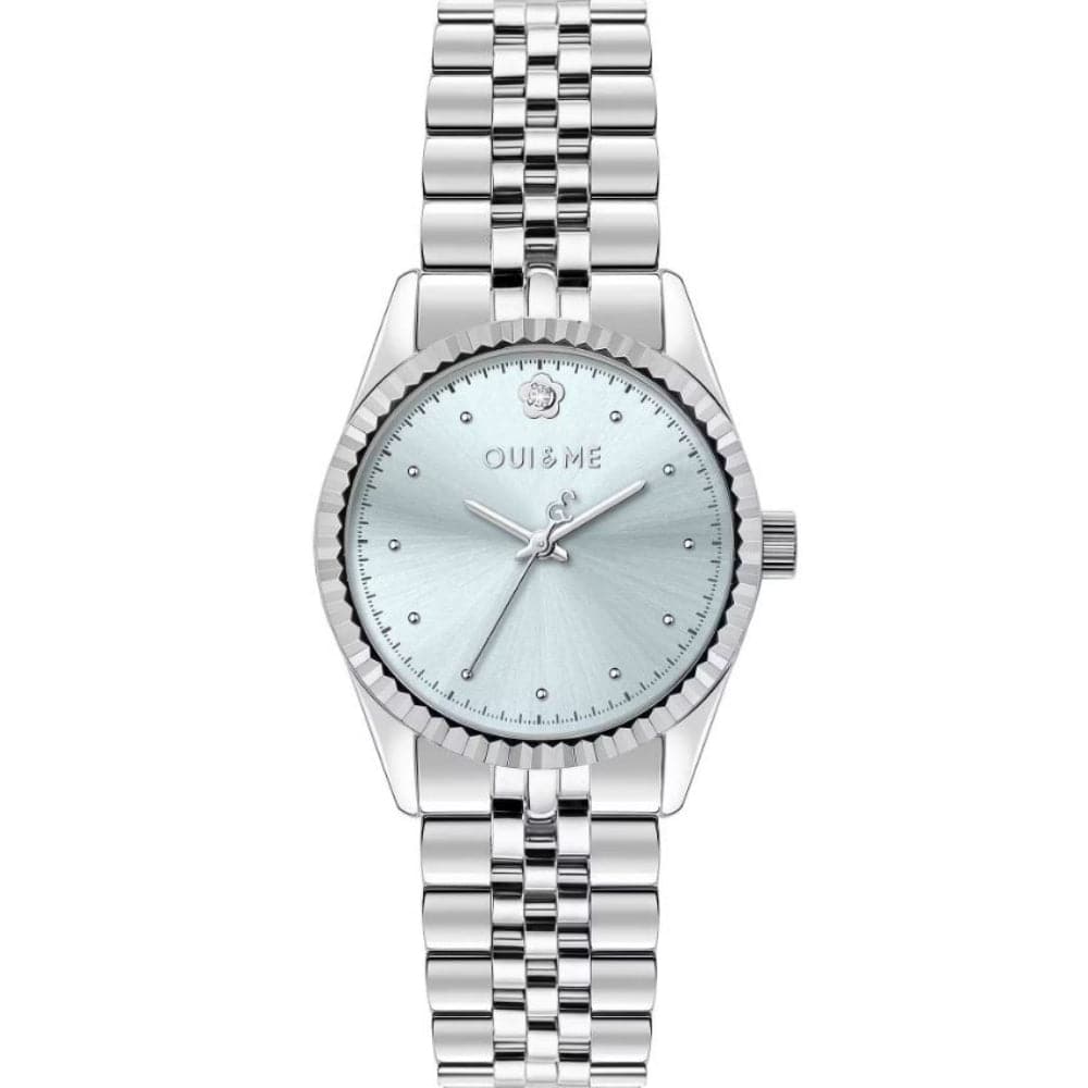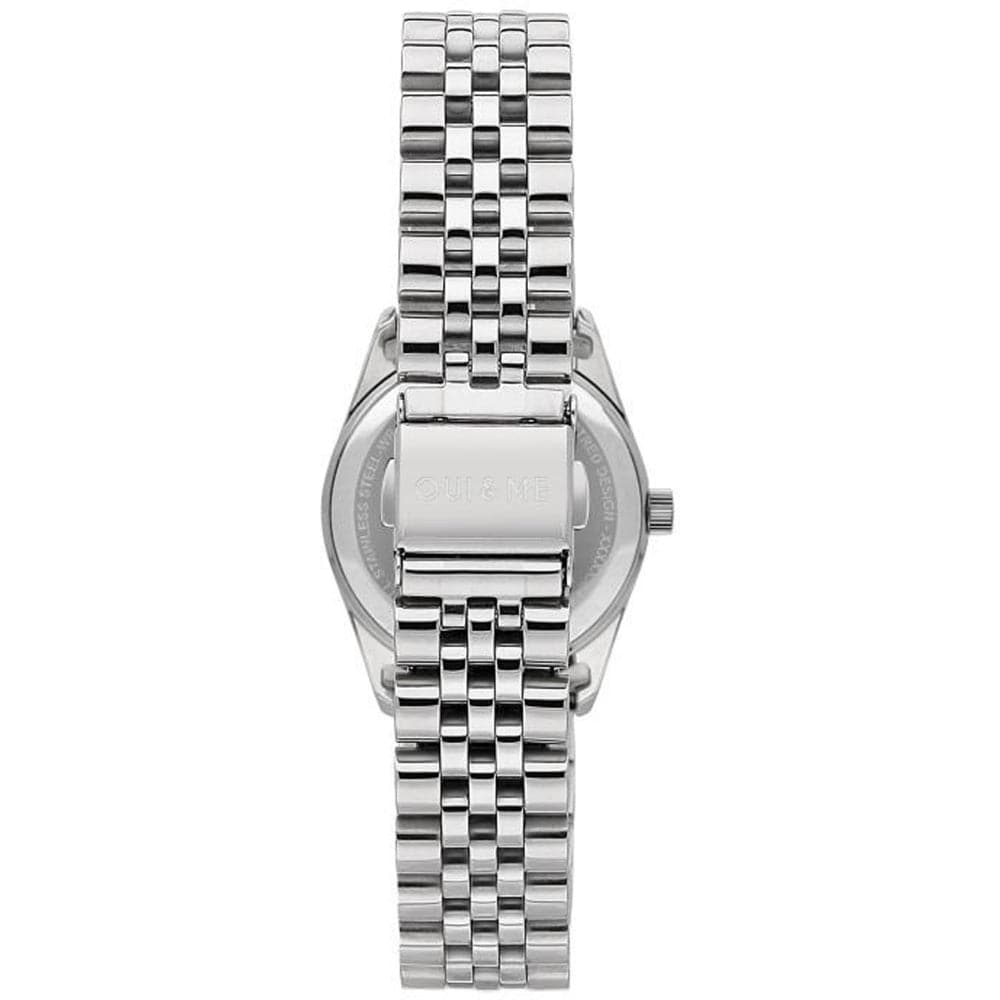 Women's time only watch by oui & me. Steel watch, natural diamonds selected h / i with steel case with polished finish of 30mm diameter with mineral glass. Silver color metal bracelet with push button deployment closure. The resistance to water is 5 atm.