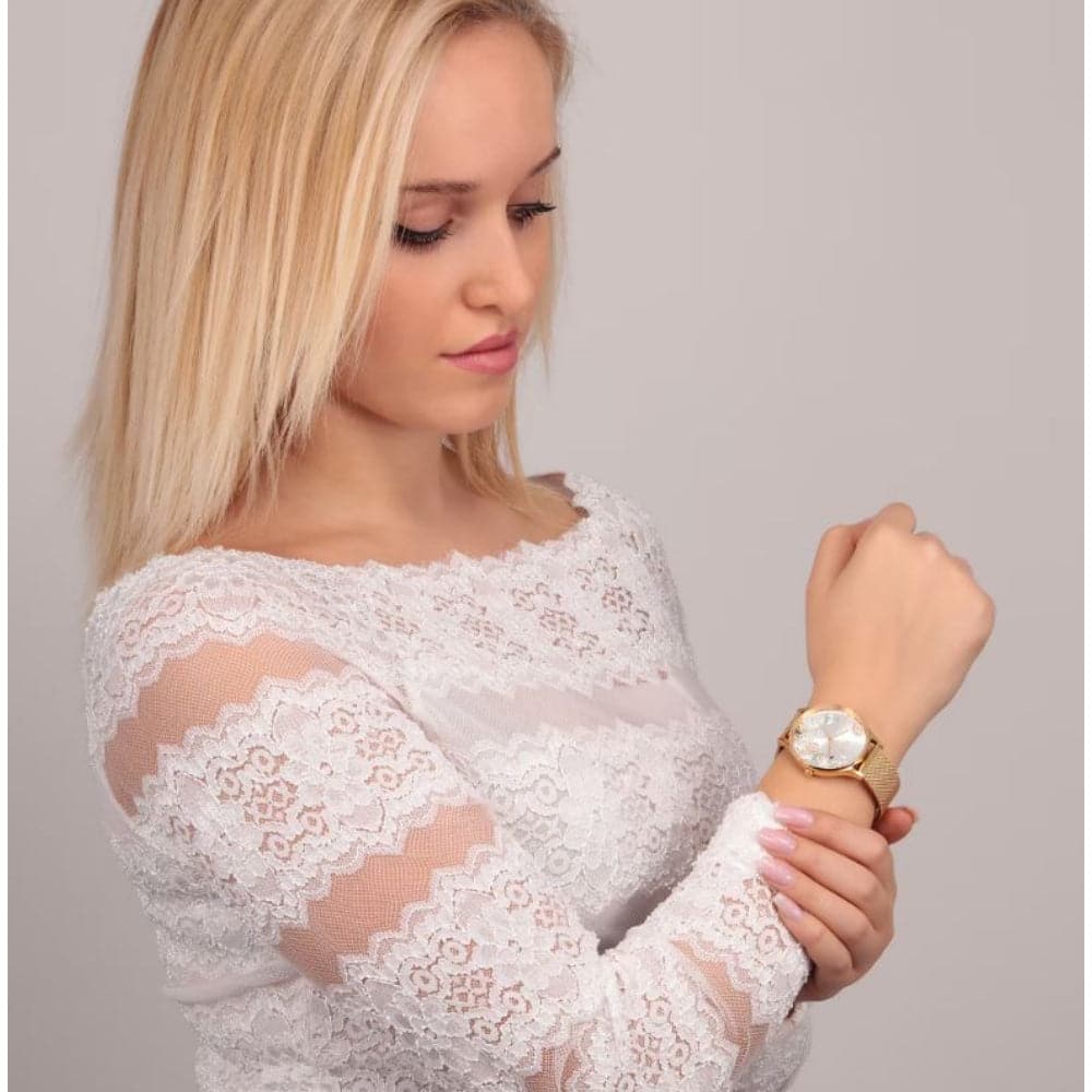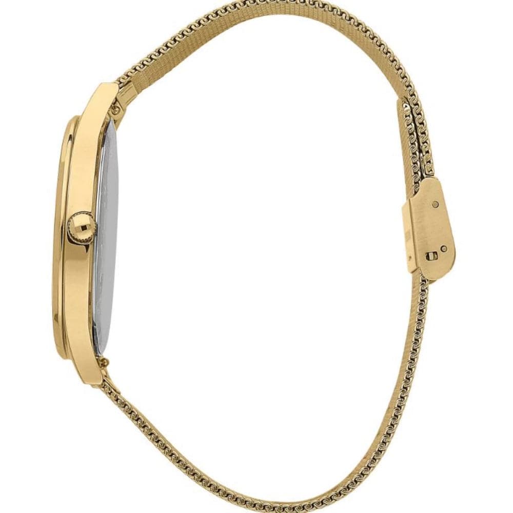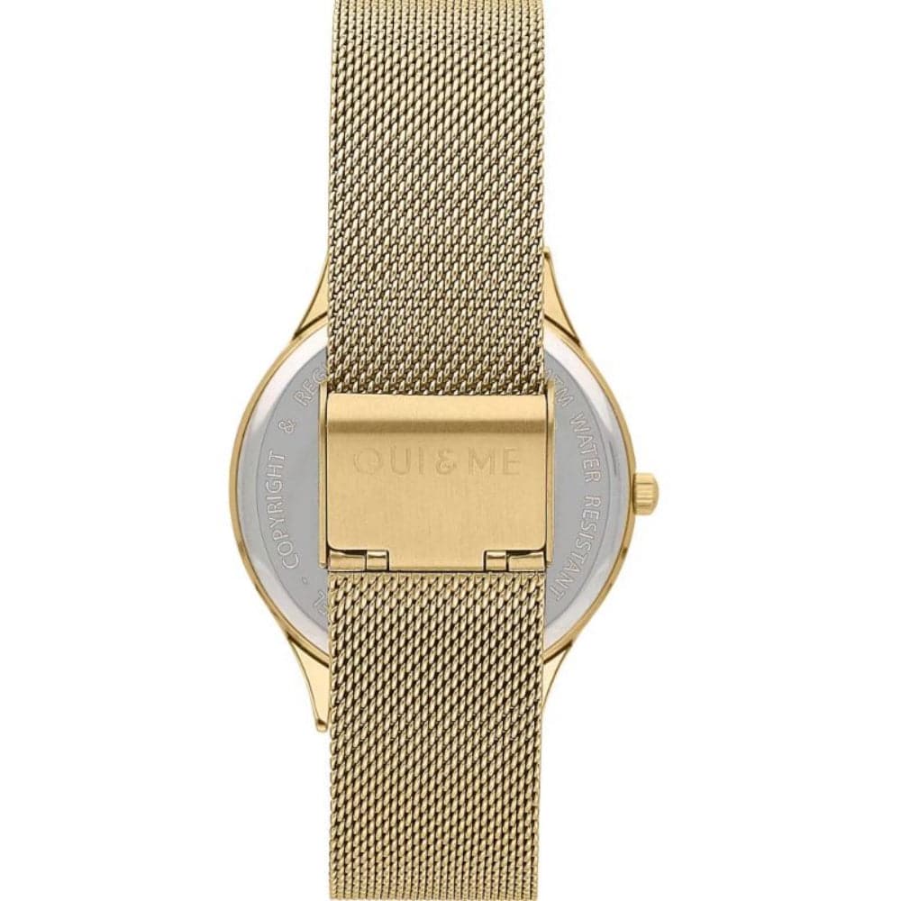Women's only time watch by oui & me from the bichette collection. Clock with steel case with glossy finish, 38 mm size. Gold-colored metal bracelet with clip and hook closure. Clock with mineral glass. Quartz movement. The resistance to water is 5 atm.