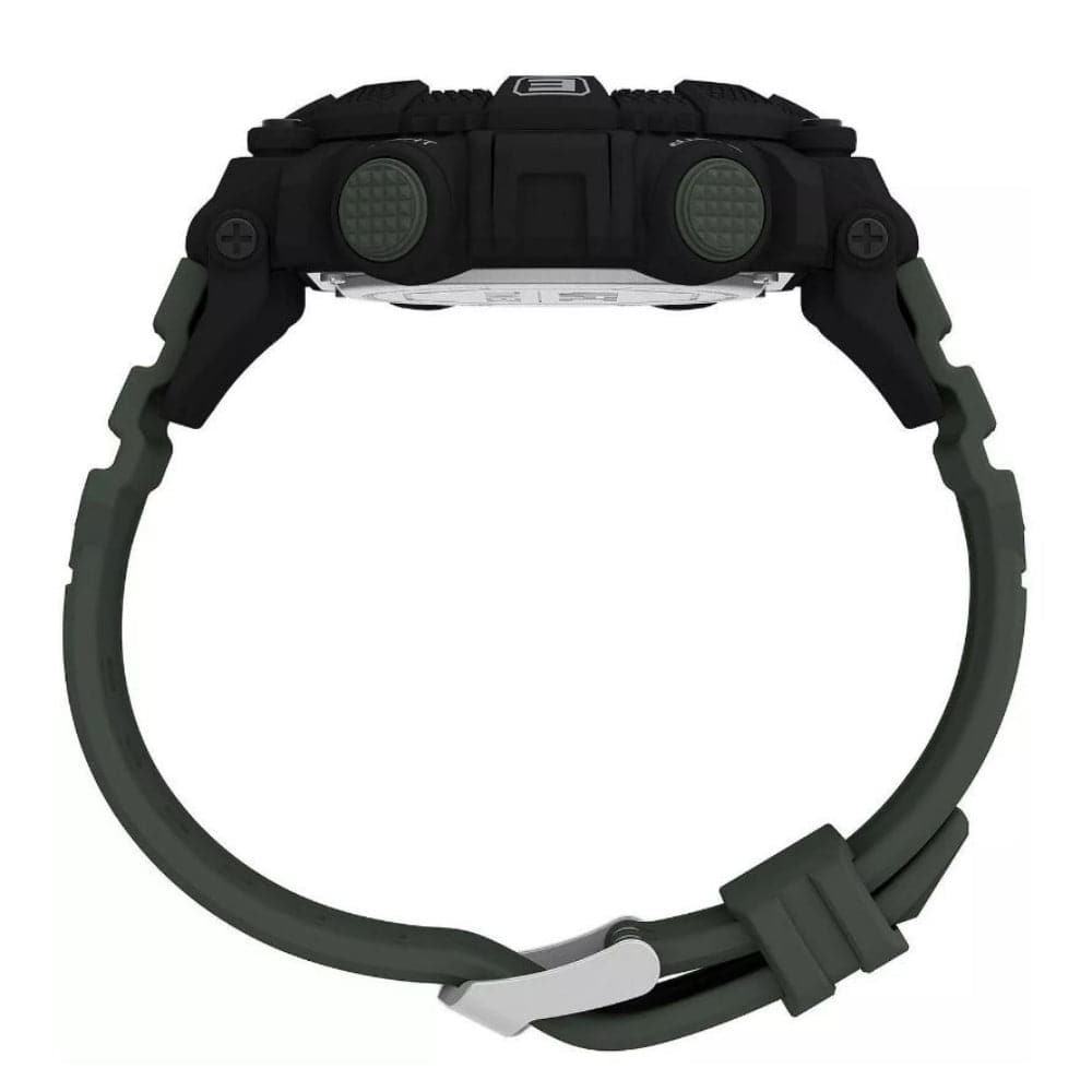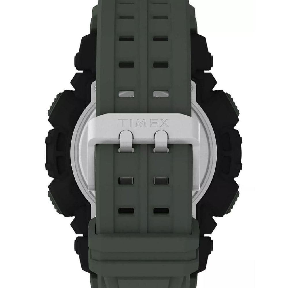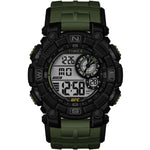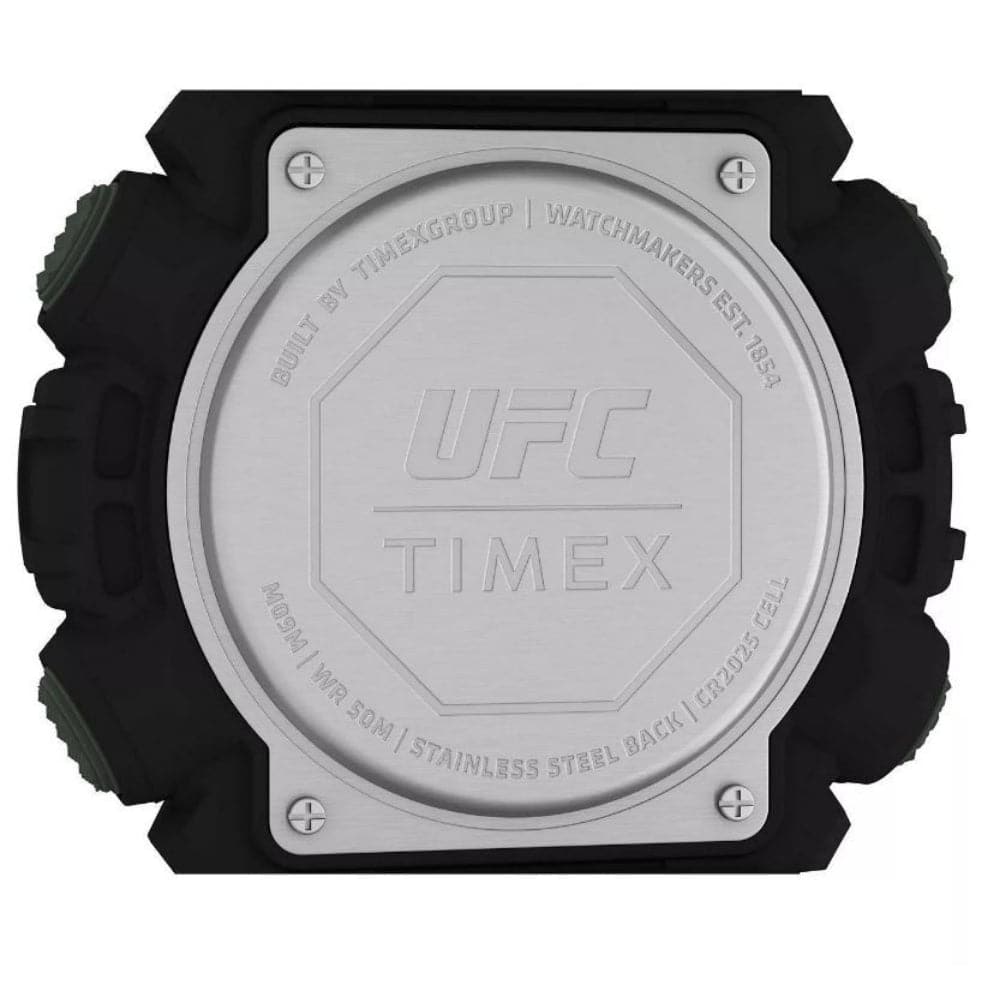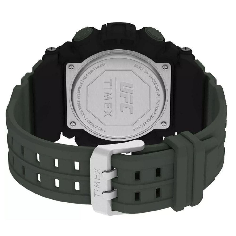 The Timex UFC Redemption TW5M53900 is a men's sports watch with features such as stopwatch, timer, 2 time zones, Indiglo backlighting, compass, day-of-the-month and day-of-the-week date, daily time and alarm. The display set in a black plastic envelope is protected by a hessalite glass. The rubber green strap sits comfortably on the wrist. The whole thing works on the basis of a quartz mechanism.