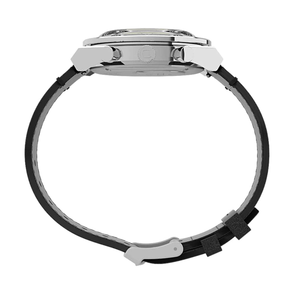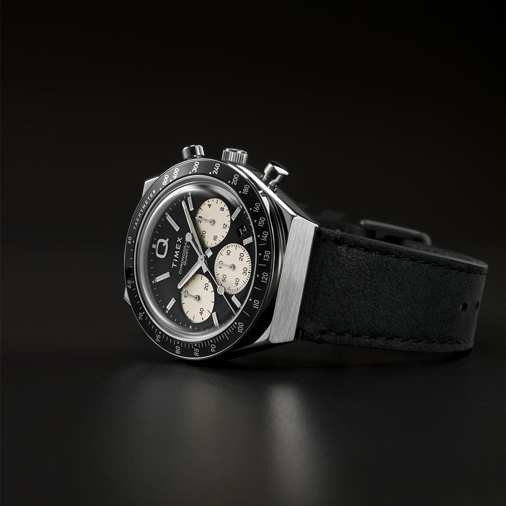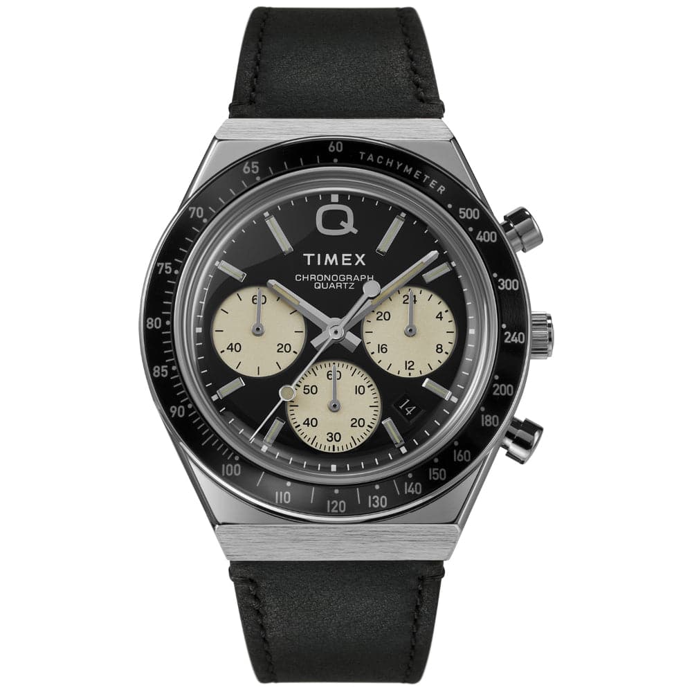 Roar across the finish line with our high-performing Q Timex Chronograph. Inspired by the original motoring watches that graced the tracks of Europe's most iconic races, this timepiece celebrates the endurance of our legendary 1970s Q Timex. An ultra-precise chronograph movement and black tachymeter bezel recreate the finesse and function of a true racing watch, allowing you to determine elapsed time and average speed like the greatest daredevils in motorsports. Contrasting sub-dials, a date feature, hand-applied dimensional indices, and an updated Q Timex logo smolder against a jet-black dial, while a brushed and polished stainless-steel case and crown bring dynamism and durability to its retro construction. Infinitely wearable, a black leather strap with quick-release spring bars makes for a sporty presentation that's ready to hit the road whenever you are.