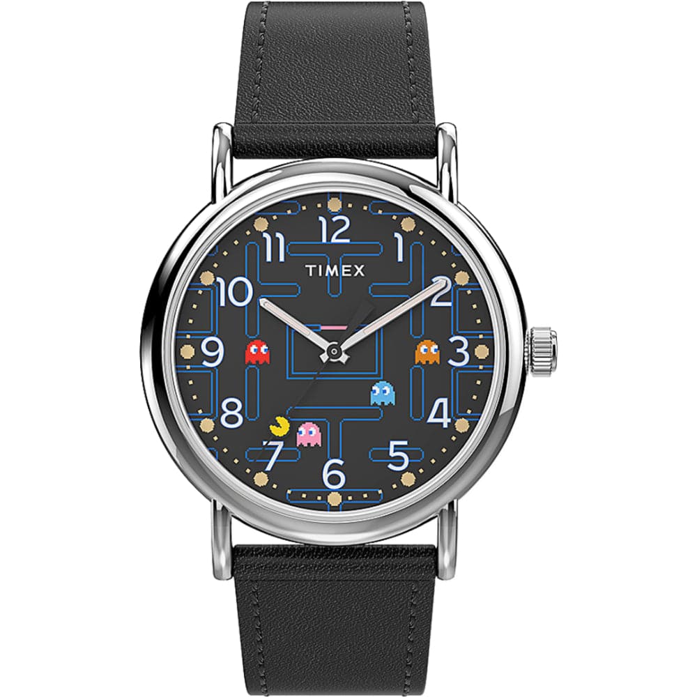 PAC-MAN™ burst onto the arcade scene and helped create a whole new kind of entertainment way back in 1980. We're introducing the iconic game's design to our classic Weekender watch, bringing the maze to life right on your wrist. PAC-MAN chomps his way around the dial positioned on the ticking seconds hand, and a hidden pattern is revealed within the dial itself when you press the crown in to light things up with INDIGLO®. The watch's 38mm silver-tone case is paired with a black genuine leather strap with quick-release spring bars, and offers a water resistance rating of 30 meters.