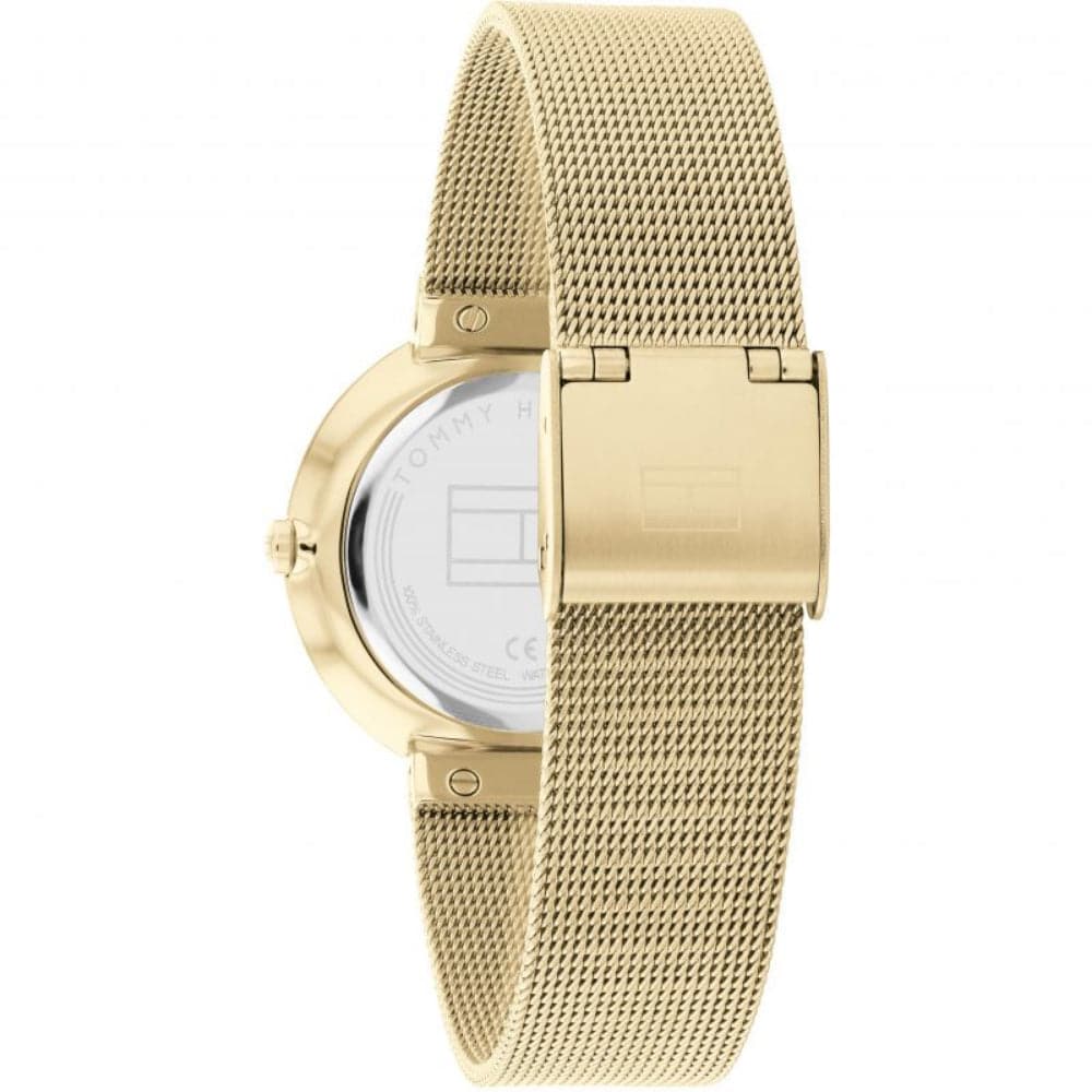 Women's watch from Tommy Hilfiger. Featuring a 32mm yellow gold case with champagne sunray dial with glitter detail. Finished on a yellow stainless steel mesh strap. Water resistant up to 3 ATM.