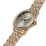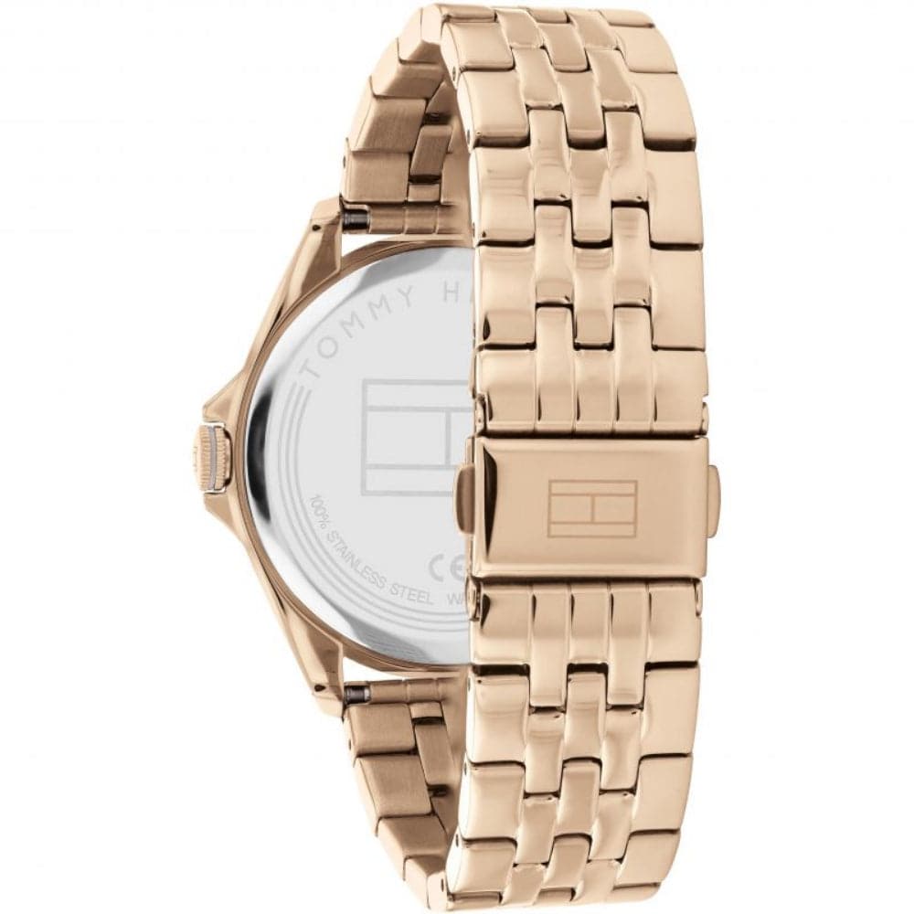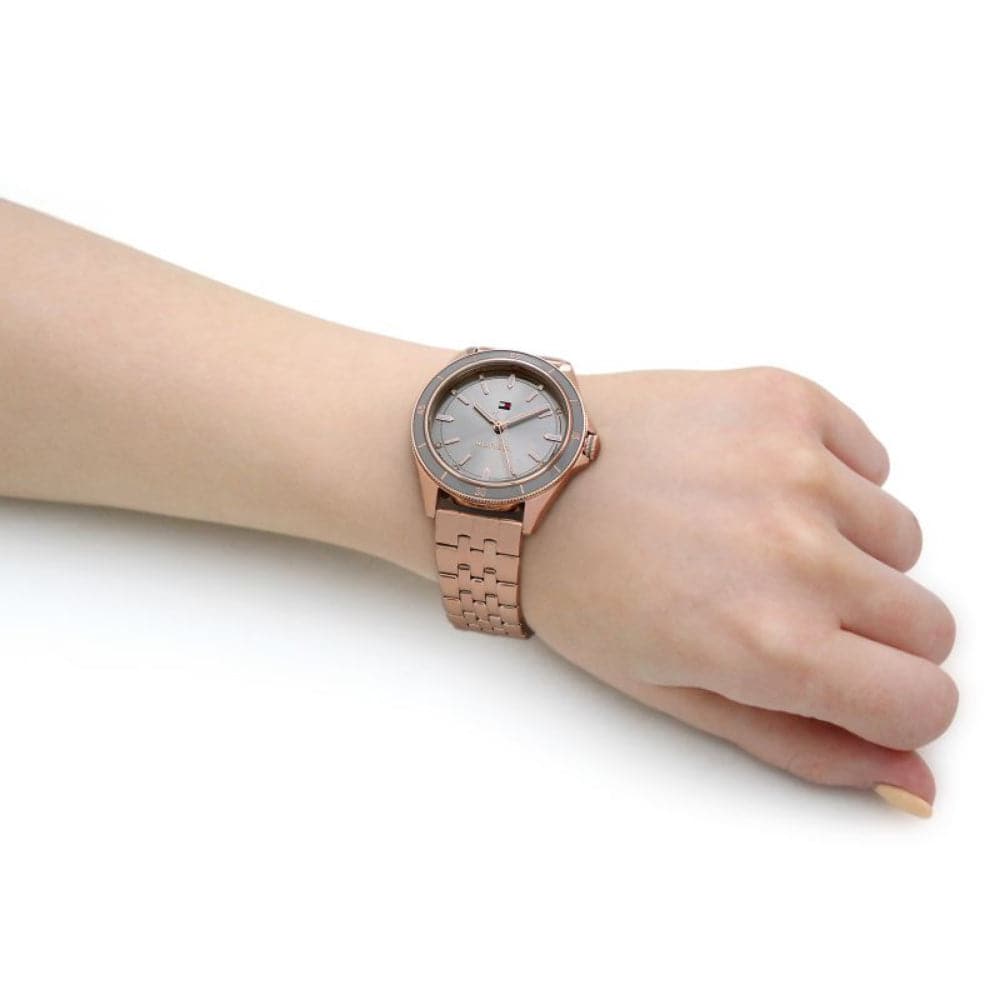 Women's watch from Tommy Hilfiger. Featuring a 38mm carnation gold case, grey bezel and silver sunray dial with rose gold accents. Finished on a five link rose gold bracelet. Water resistant up to 5 ATM.