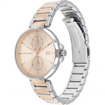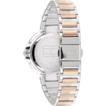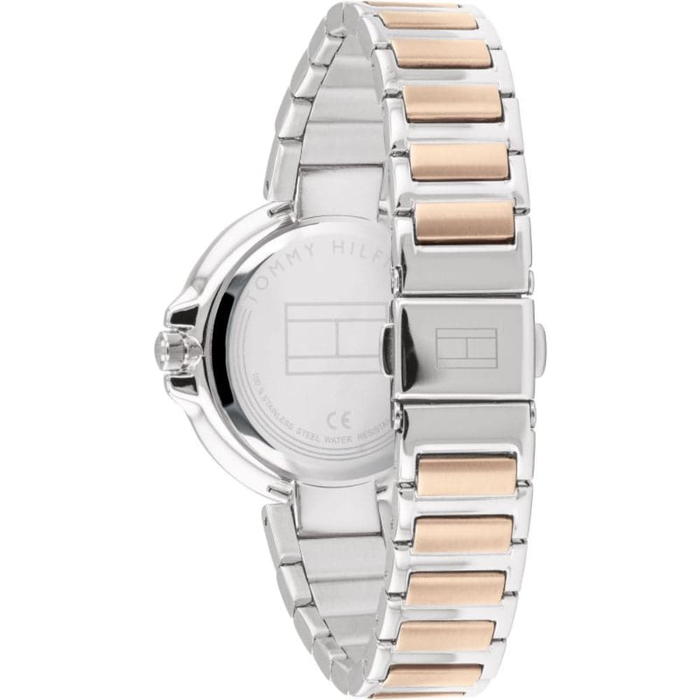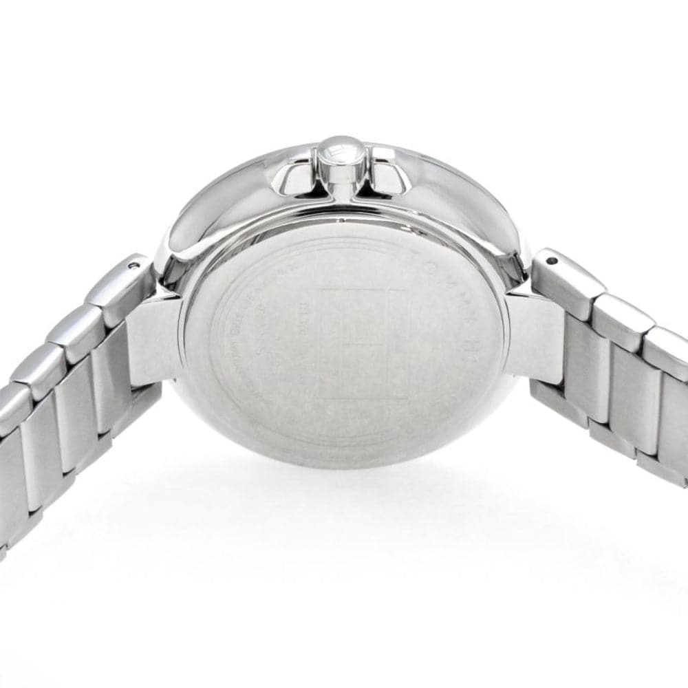 Stainless steel case with a black leather strap. Fixed stainless-steel bezel. Black dial with silver-tone hands and index hour markers. Arabic numerals mark the 3, 6, 9 and 12 o'clock positions. Minute markers around the outer rim.