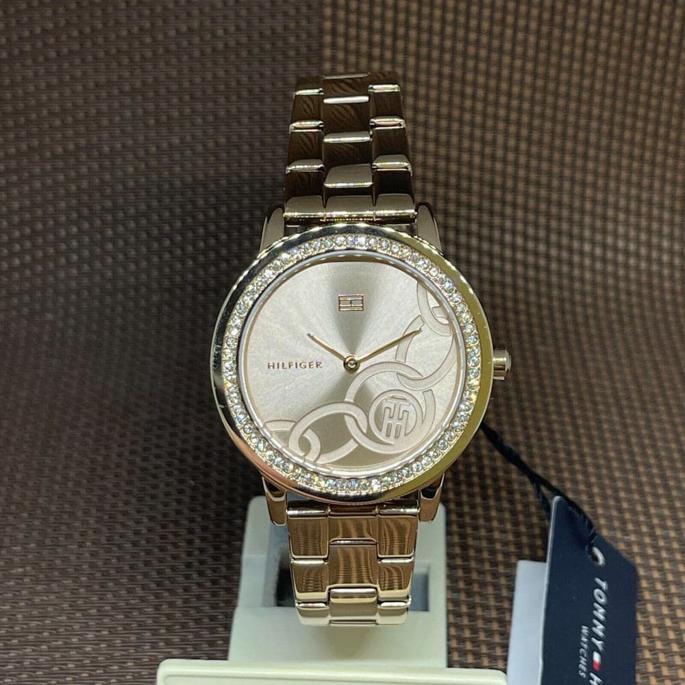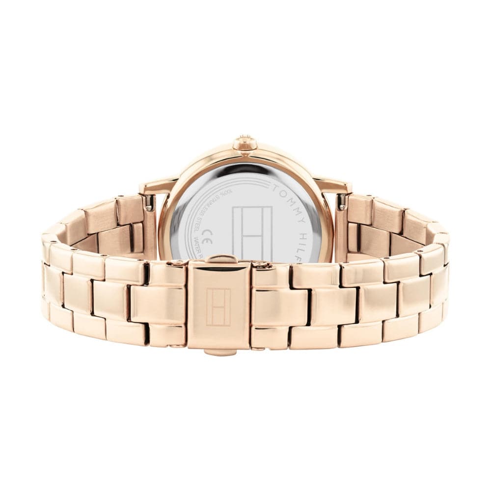 Set in a high shine case, this women's analog watch from Tommy Hilfiger is sure to catch your attention. Safeguarded by a mineral glass, the rose gold round dial is encased in a 34 mm case. It features plain two hands and a crown for time adjustment. The stainless steel strap exudes a rose gold hue that accentuates the look of the watch. Moreover, it is fitted with a push-button clasp that ensures a secure fit on the wrist.