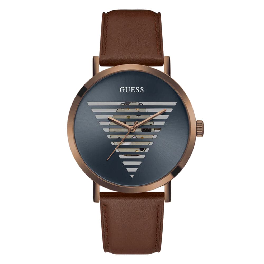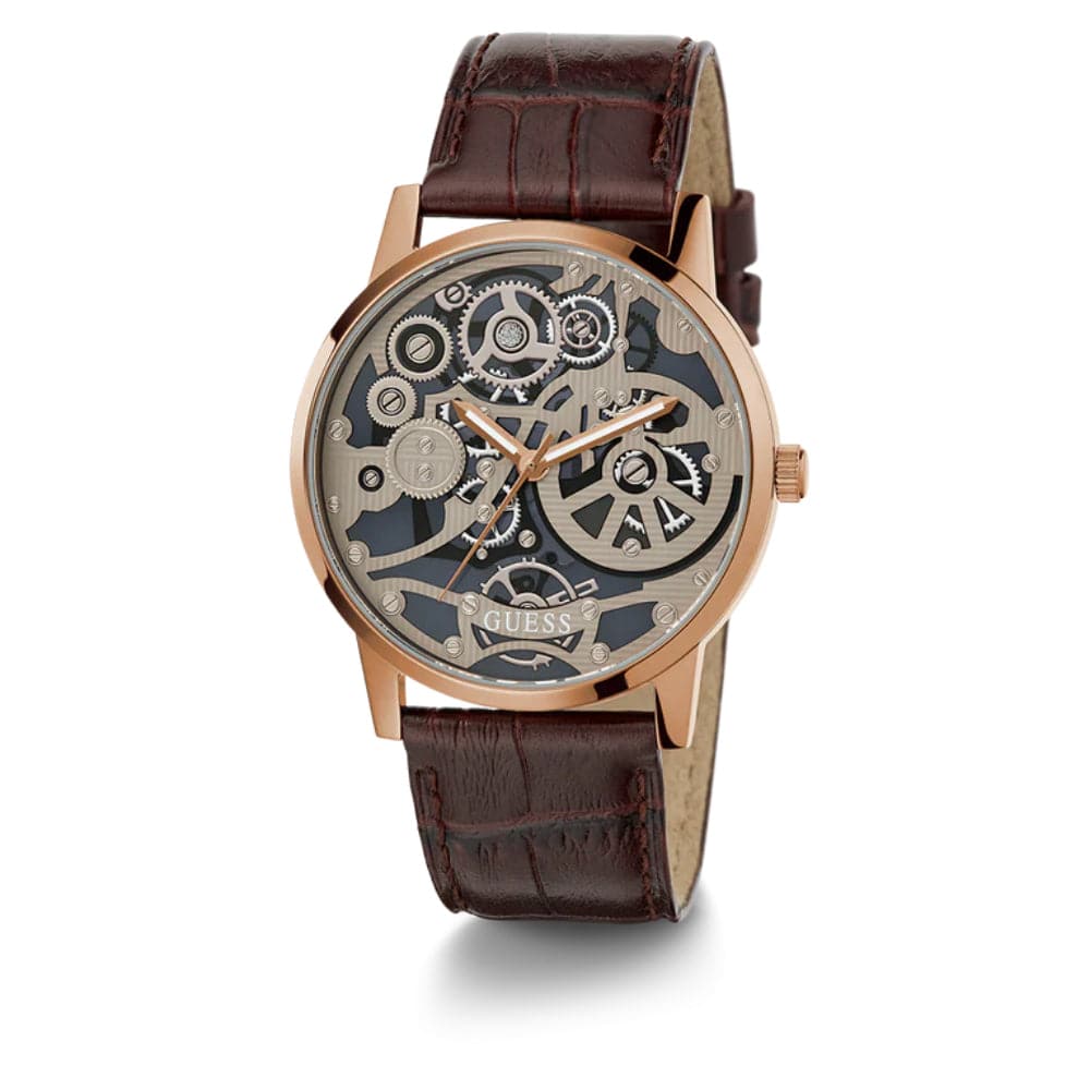 Guess Skeleton Dial Brown Leather Strap Men Watch GW0570G2
