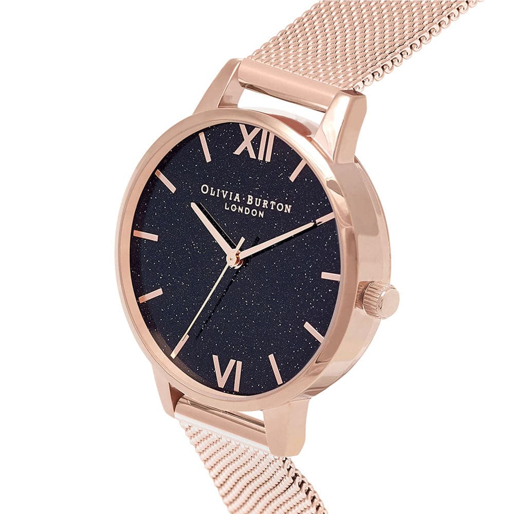 Olivia Burton Black Gliter Dial Rose Gold Milanese Strap Women Watch OB16GD76