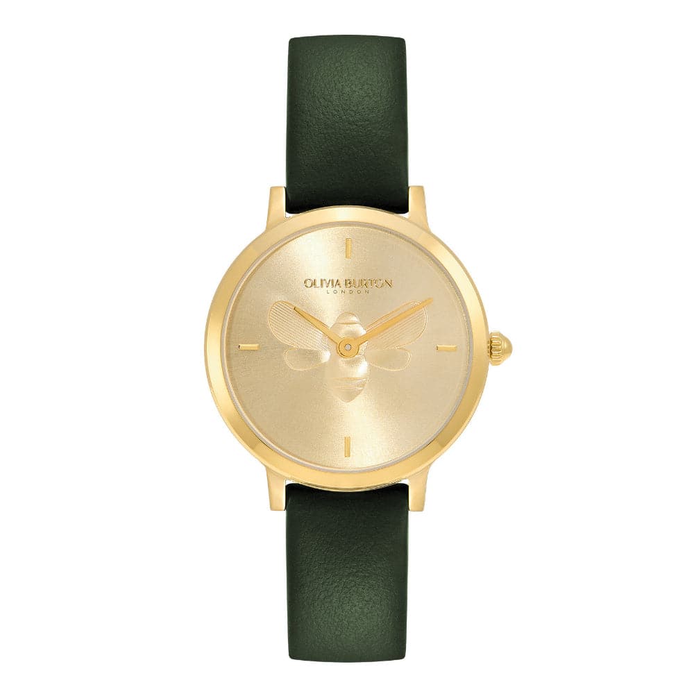 Olivia Burton Signature Bee Ultra Slim Gold & Green Leather Strap Women Watch 24000017