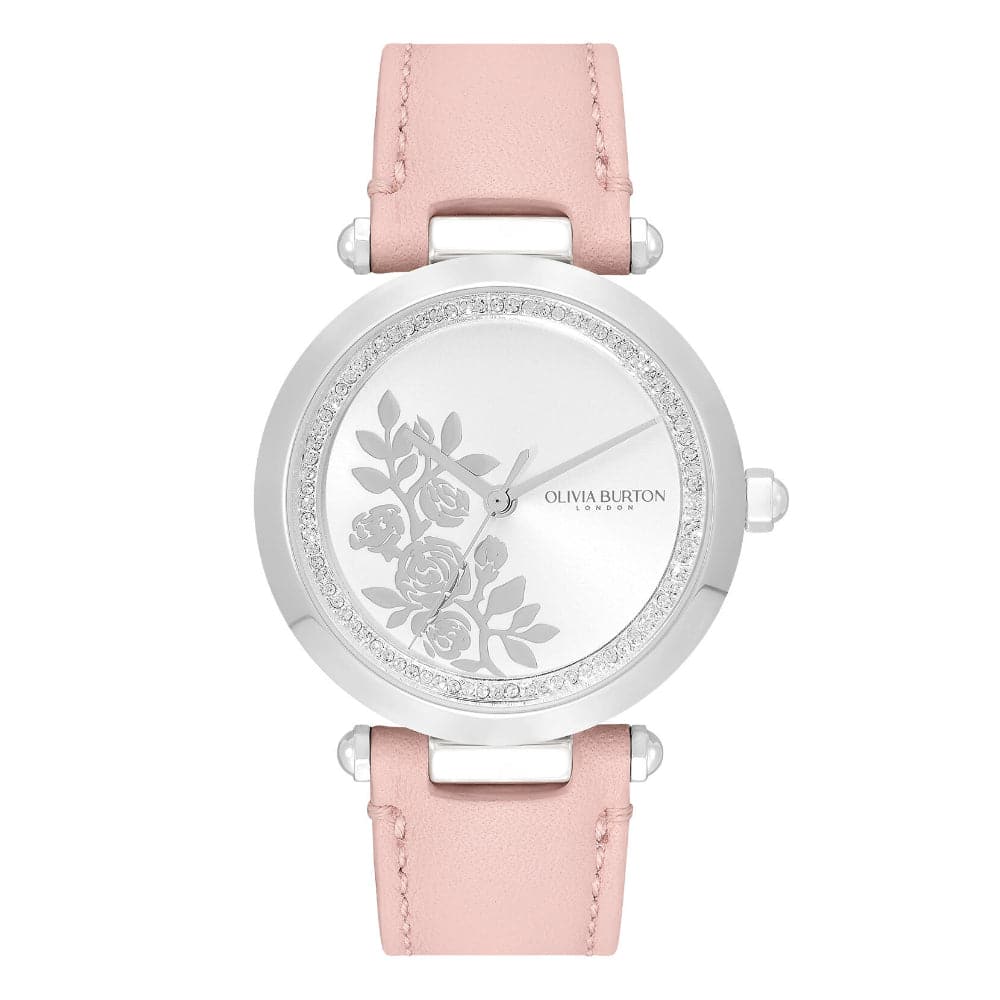 Olivia Burton Signature Floral T-Bar Silver & Rose Leather Strap Women Watch 24000046