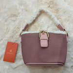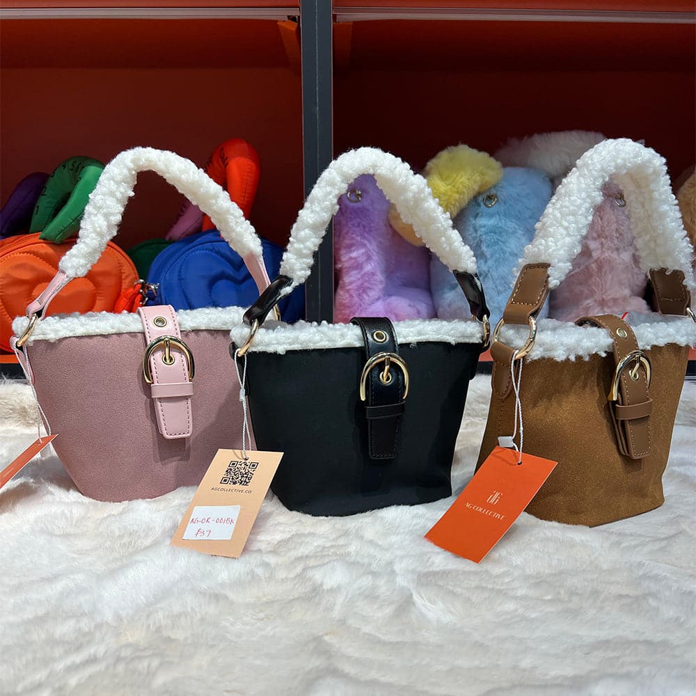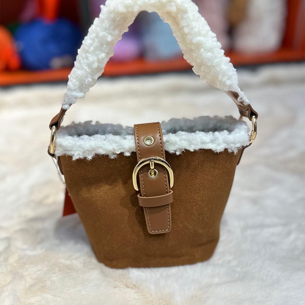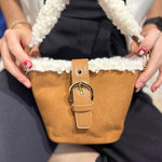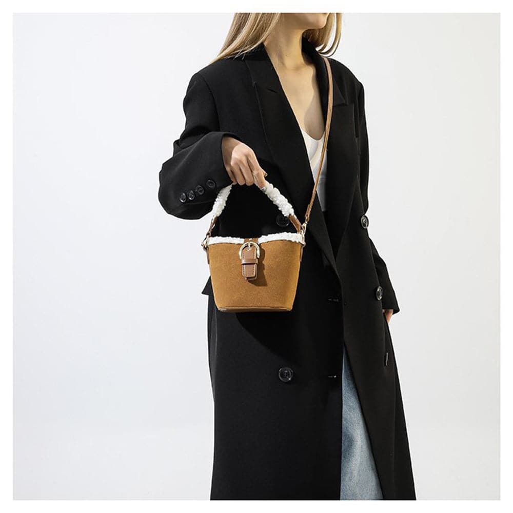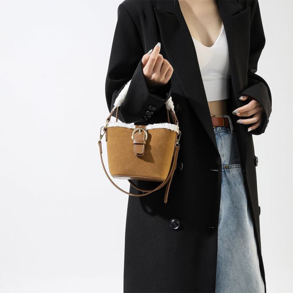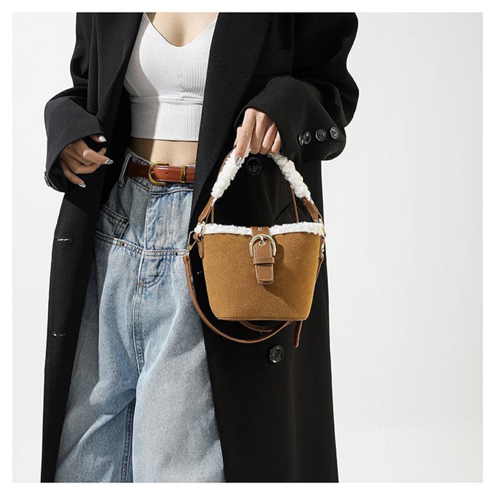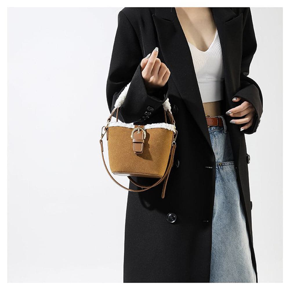 The AG Collective Faux Suede Buckle Top Handle Bucket Women Hand Bag is a stylish and practical accessory for any woman on the go.