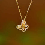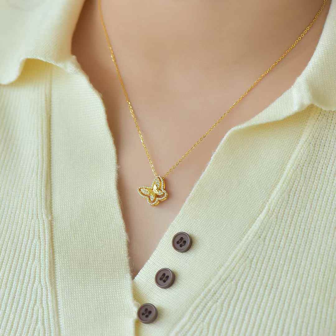 Meticulously crafted with a luminous gold finish and encrusted with fine shimmering stones, the butterfly pendant reflects light with every subtle movement, creating a gentle glow that enhances your natural radiance. Its slender, refined chain rests elegantly against the skin, making it perfect for both everyday luxury and elevated occasions.