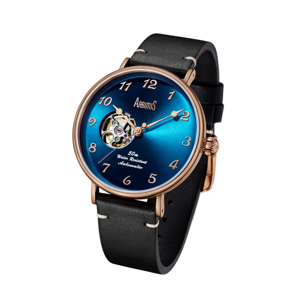 ARBUTUS 9o'clock Open Heart AR1805RUB is a fashionable and classy automatic watch with a beautiful blue dial and genuine black leather straps. It also has precise automatic movements with increased precision.