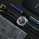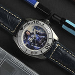 The blue leather strap adds a touch of sophistication to this already stunning timepiece. The strap is made from high-quality materials, ensuring comfort during extended wear periods.