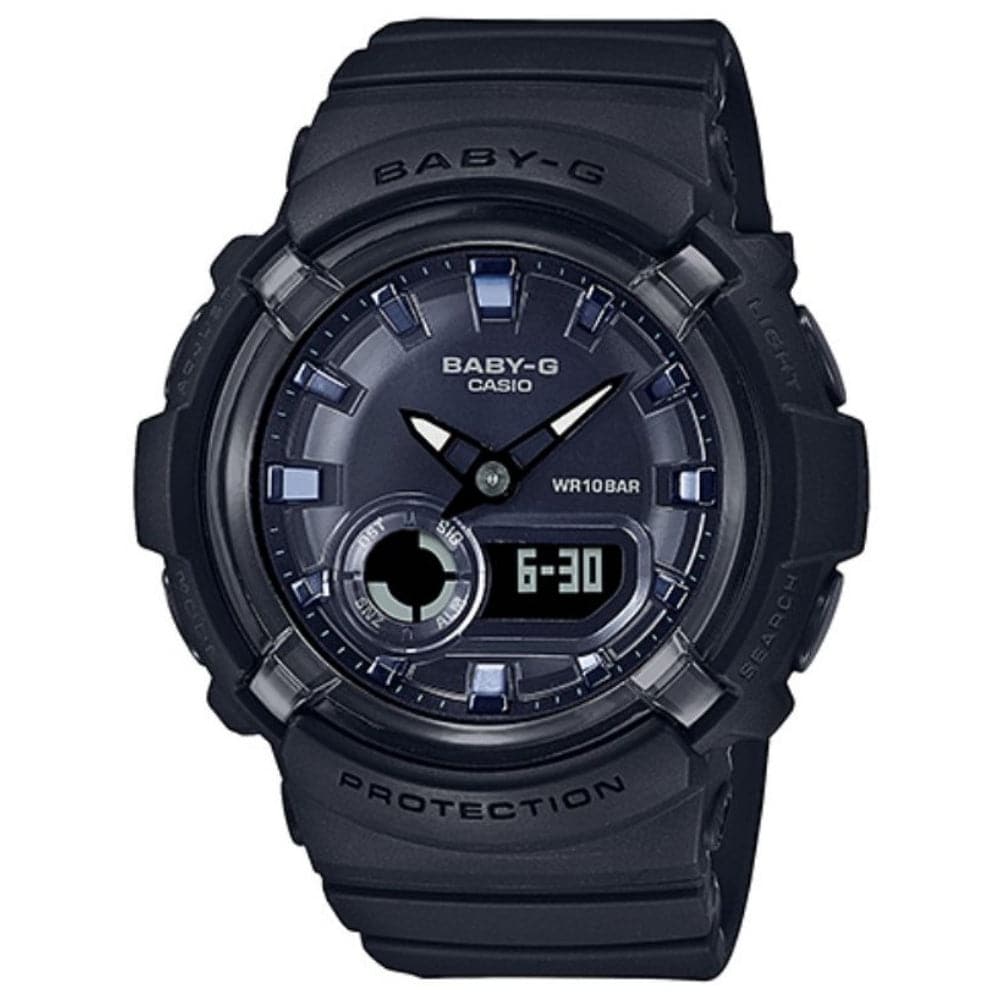 The BGA-280 Series layers multiple parts to create innovative and colorful designs. The round cases of these models and the cute impression of their hefty forms are complemented by the sporty touch of the metallic hour markers. The models in this series are available in a choice of three colors: black, coral pink, or white. The black model has a cool look, while the coral pink model is BABY-G cute. The face of the white model has a pastel tie-dye look, while the case combines white with grayish blue for a truly distinctive look.
