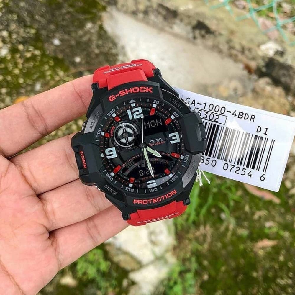 Other features include temperature measurement, large numerals, and thick hands for easy reading. A coating on the tip of the second hand and minute markers reacts with the black light illumination of the watch for easy reading in the dark.