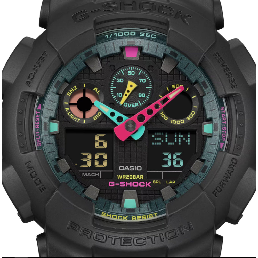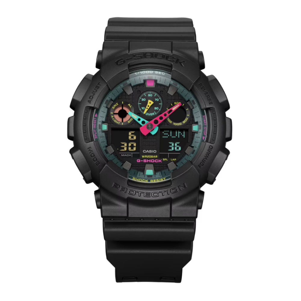 The matte black bezel and band contrast stylishly with touches of vivid blue, pink, and yellow on the hands, hour markers, and dial marks, transporting you to a virtual world. Playful and bold, these designs will crush in any fashion scene.