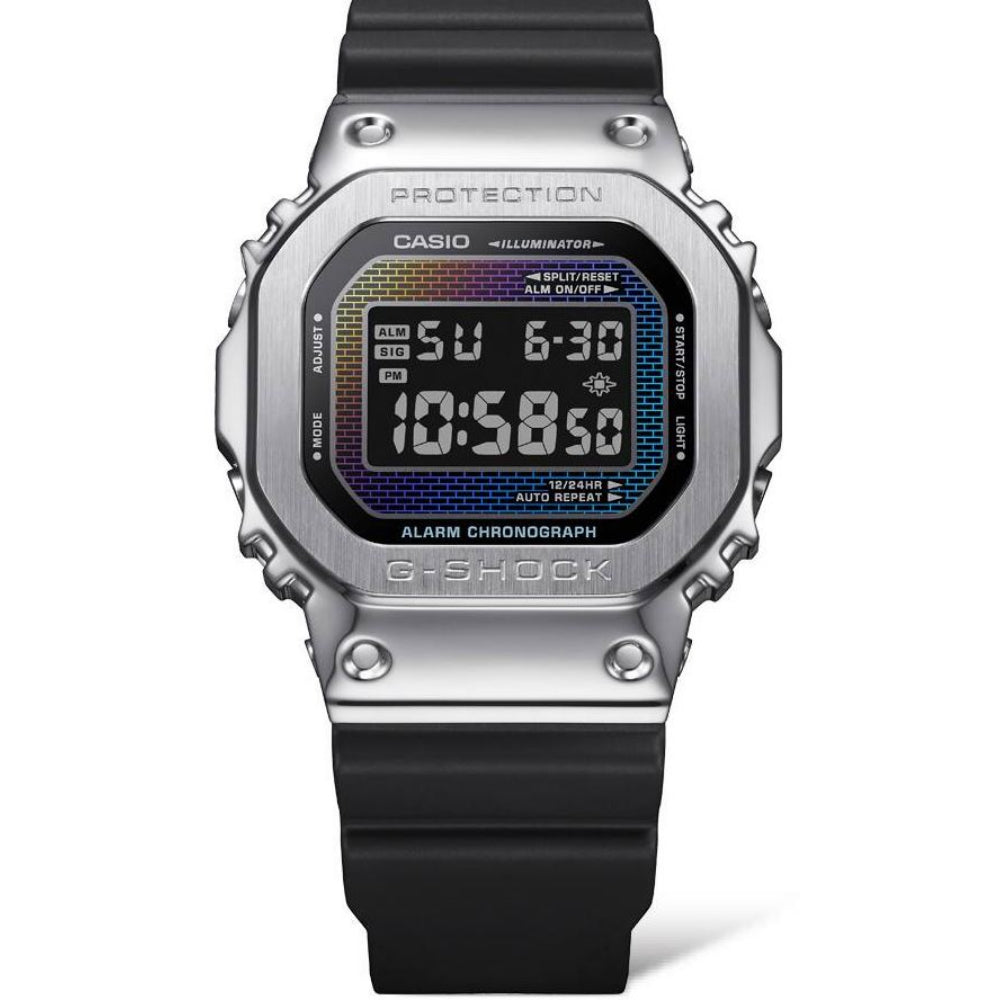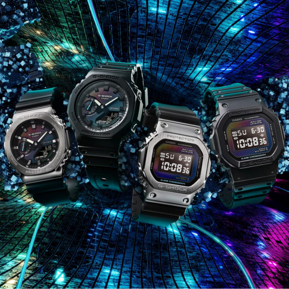 For the DW-5600 and GM-5600 models, the watch glass features the color-shifting brick pattern reproduced with vapor deposition in a rainbow-hued gradation. For the GA-2100 and GM-2100 models, the dial’s iridescent brick pattern is achieved with a combination of silver vapor deposition, laser etching, and rainbow-colored printing.