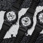 Beginning with a base of G-SHOCK jet black and then bring in a bright dial finished in brilliant white vapor deposition. The monochromatic statement is a study in contrasts—matte black against glossy white. This abundantly cool design is available in five different models.