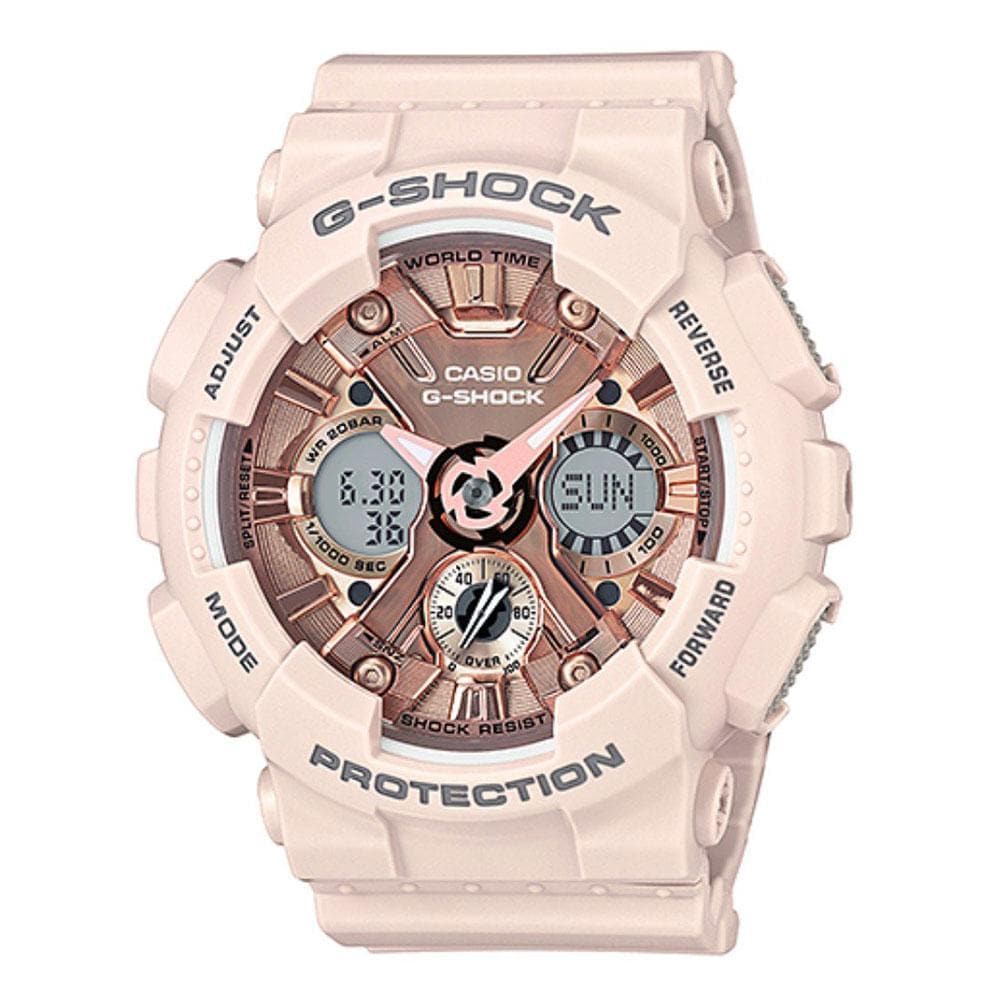 A model based on a mid-size version of the popular digital-analog combination GA-120 model. The metallic face is finished in pink gold and the bezel and band are finished in pink to create a casual, feminine model. A trendy smaller G-SHOCK perfect for youth culture.