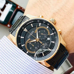 Outfitted with chronograph precise to within a second throughout a 60 minute period, tachymeter for next level accuracy and a reliable Quartz movement mechanism, this is a watch that works as hard as you do. For enhanced performance it offers a 2 year battery life, uncomplicated markings, date display and 12 and 24 hour time dials. Crafted from rugged stainless steel and black ion plating that imbues the watch with seductive black and gold tones and a sophisticated aesthetic, it is the ideal watch for the office or hitting the town with friends.