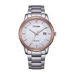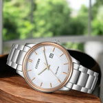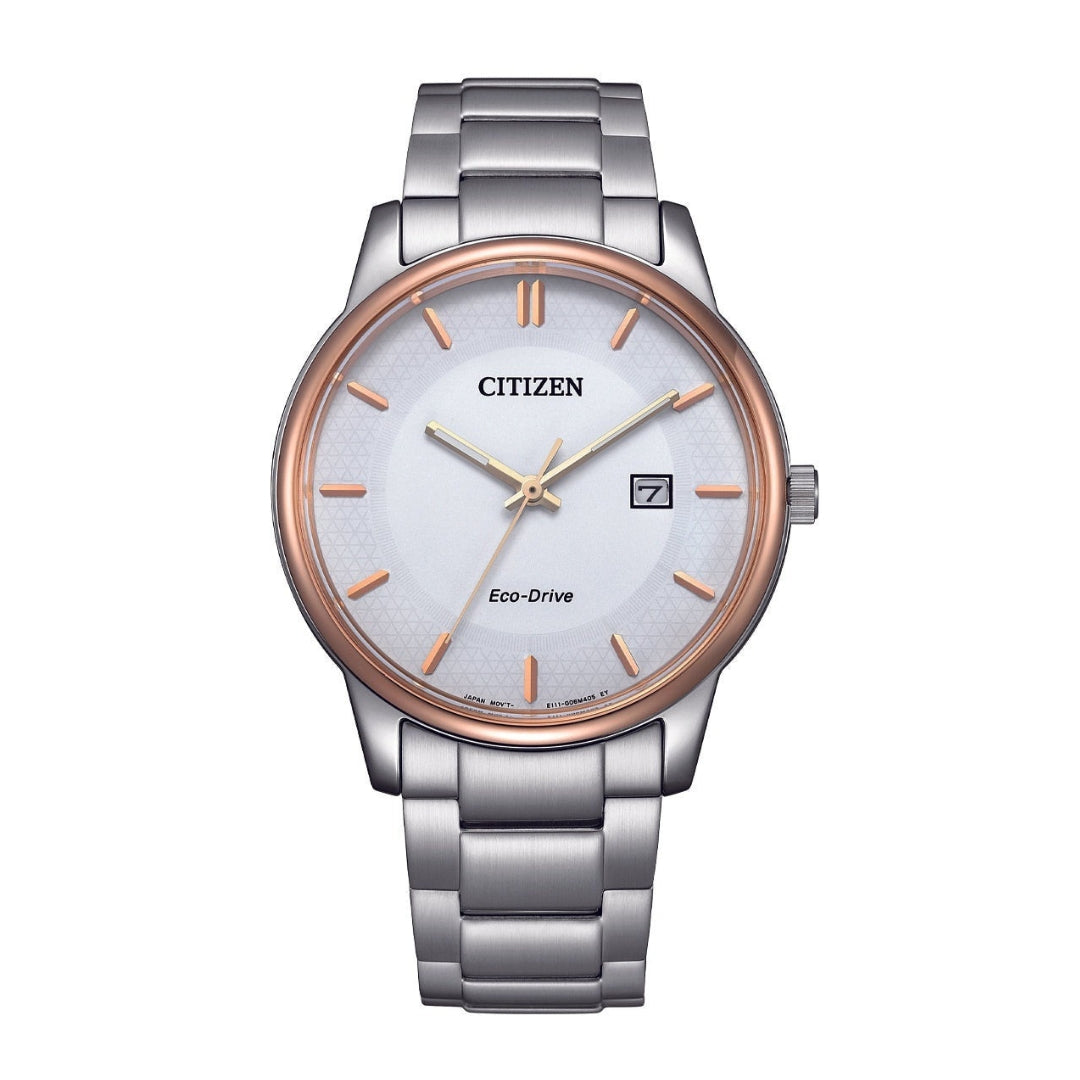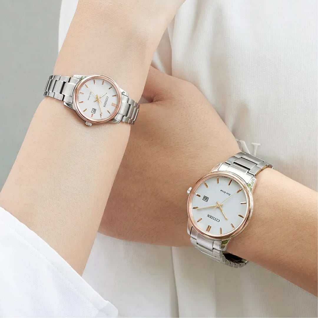 A modern timepiece that exudes classic aesthetic appeal, this watch is as reliable as it is stylish. It features a smooth white sleek dial paired with a stainless steel bracelet, creating a timeless look. Key features include a date display, push-button buckle, and a low charge indicator. Powered by our Eco-Drive technology, this watch never needs a battery—just a light source.